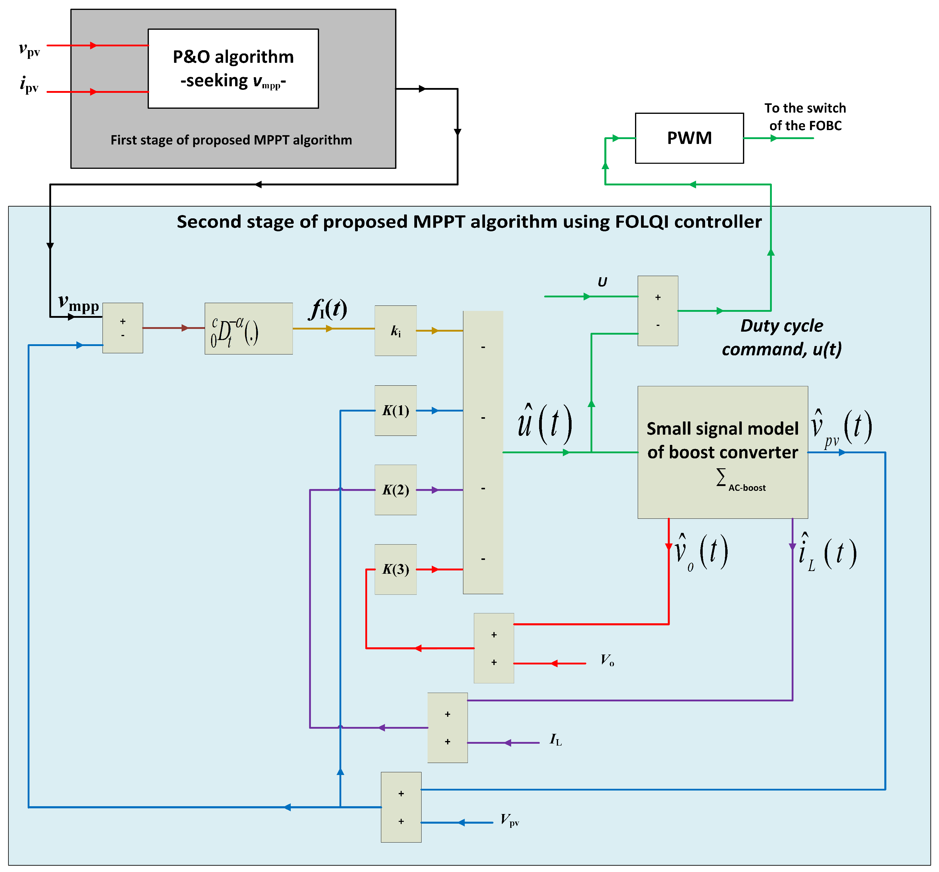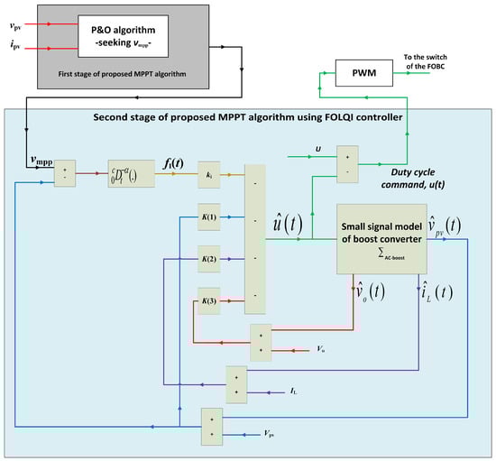 Figure 6. Scheme of proposed two stage MPPT algorithm using FOLQI controller for PV-module voltage regulation.