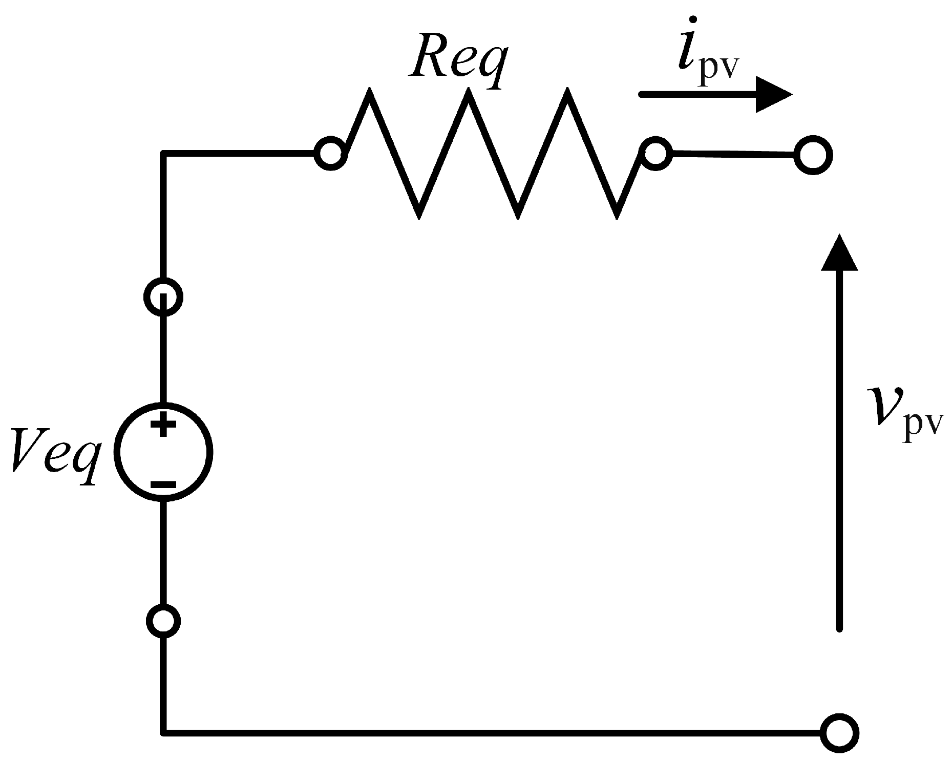 It can be depicted through the corresponding circuit illustrated in Figure 3, where R e q is defined as −1/a, and V e q is expressed as V M P P ( I M P P / a ) .