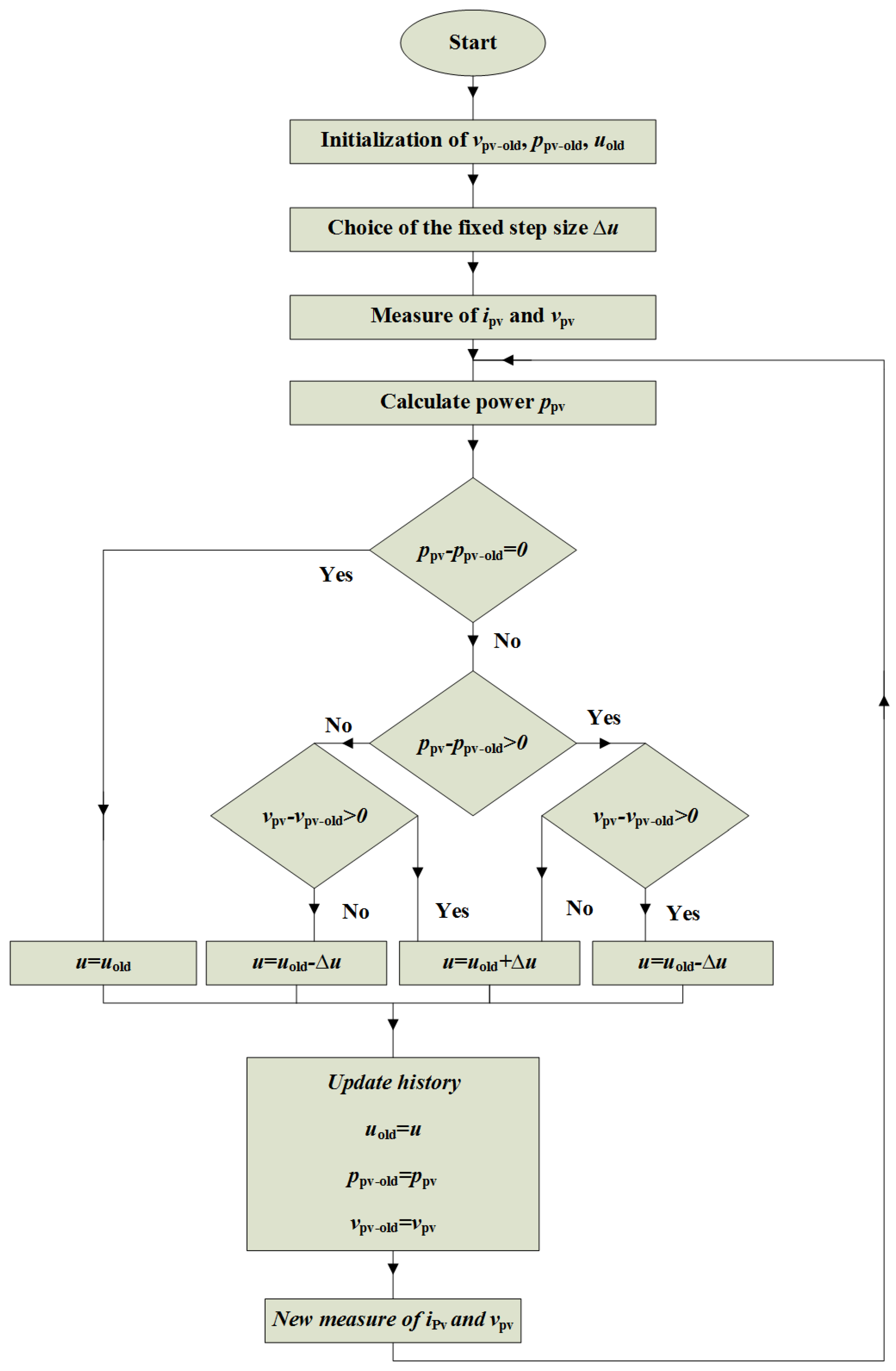 Figure 5. Flowchart of the conventional direct control method using P&O algorithm for MPPT.