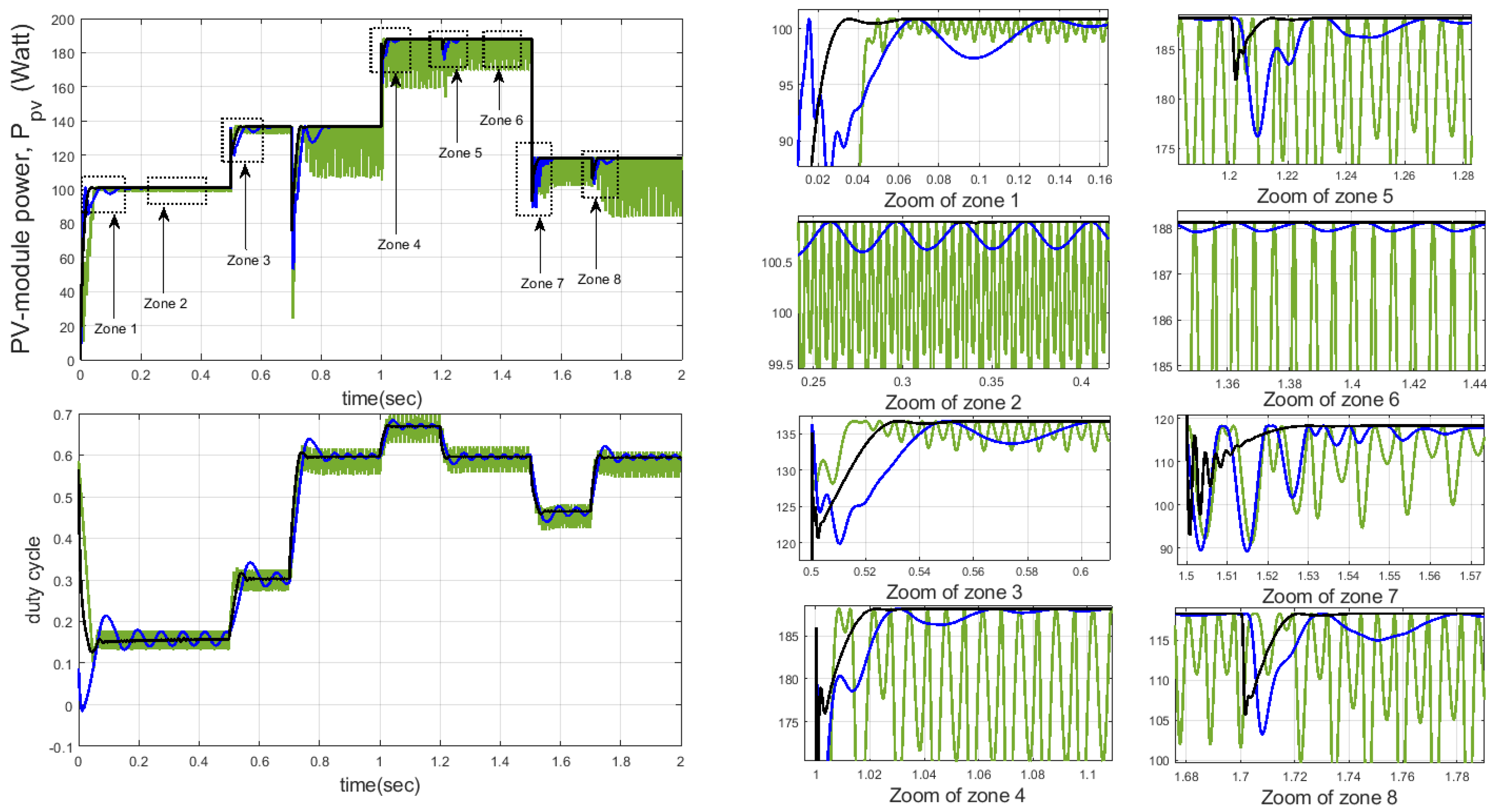Figure 11. PV-module output power and duty cycle using synthesized MPPT approaches: Black line for MPPT based on FOLQI controller, blue line for MPPT based on integer LQI controller, green line for P&O algorithm.