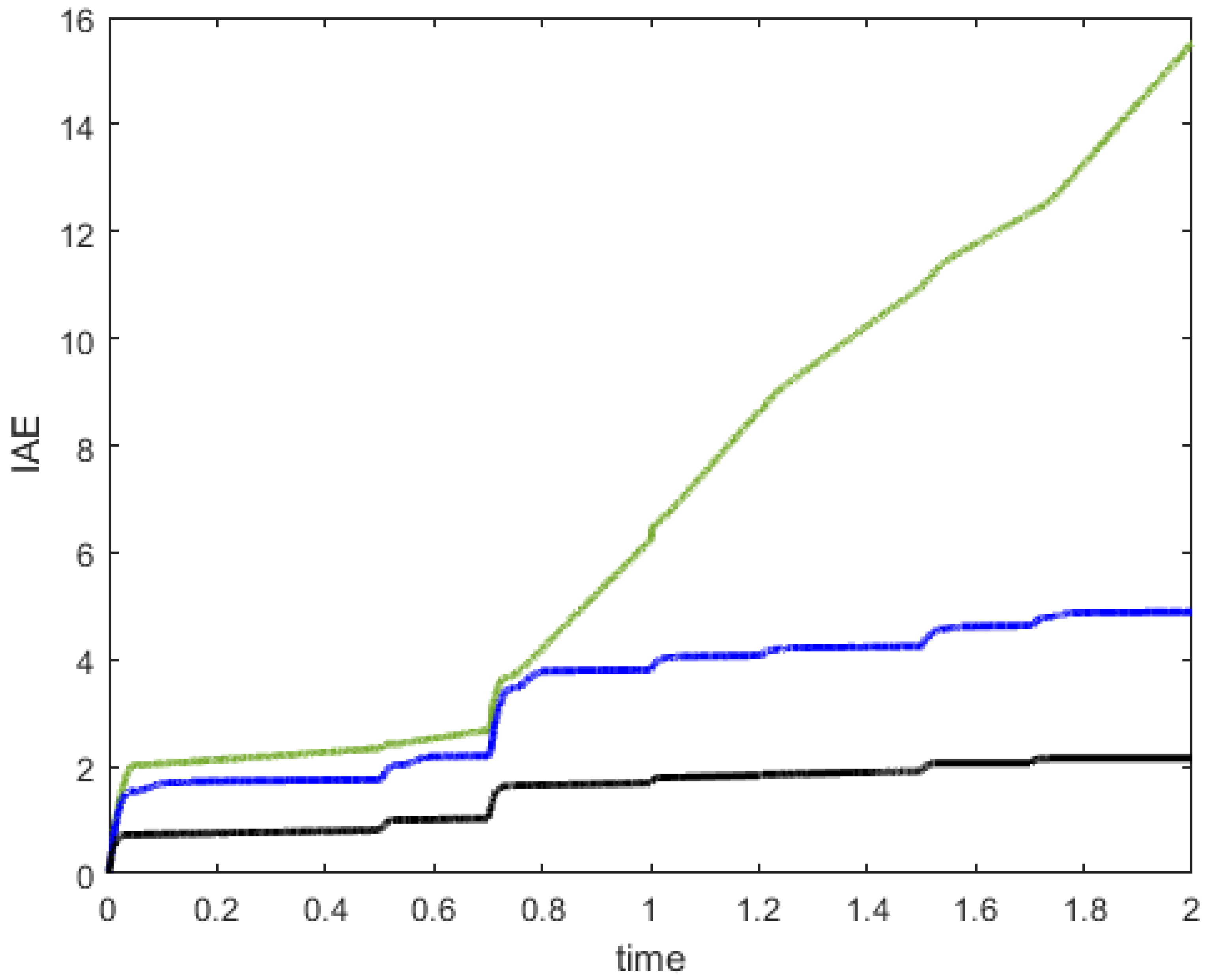 Figure 13. Comparison of the synthesized MPPT approach with respect to IAE: Black line for MPPT based on FOLQI controller, blue line for MPPT based on integer LQI controller, green line for P&O algorithm.