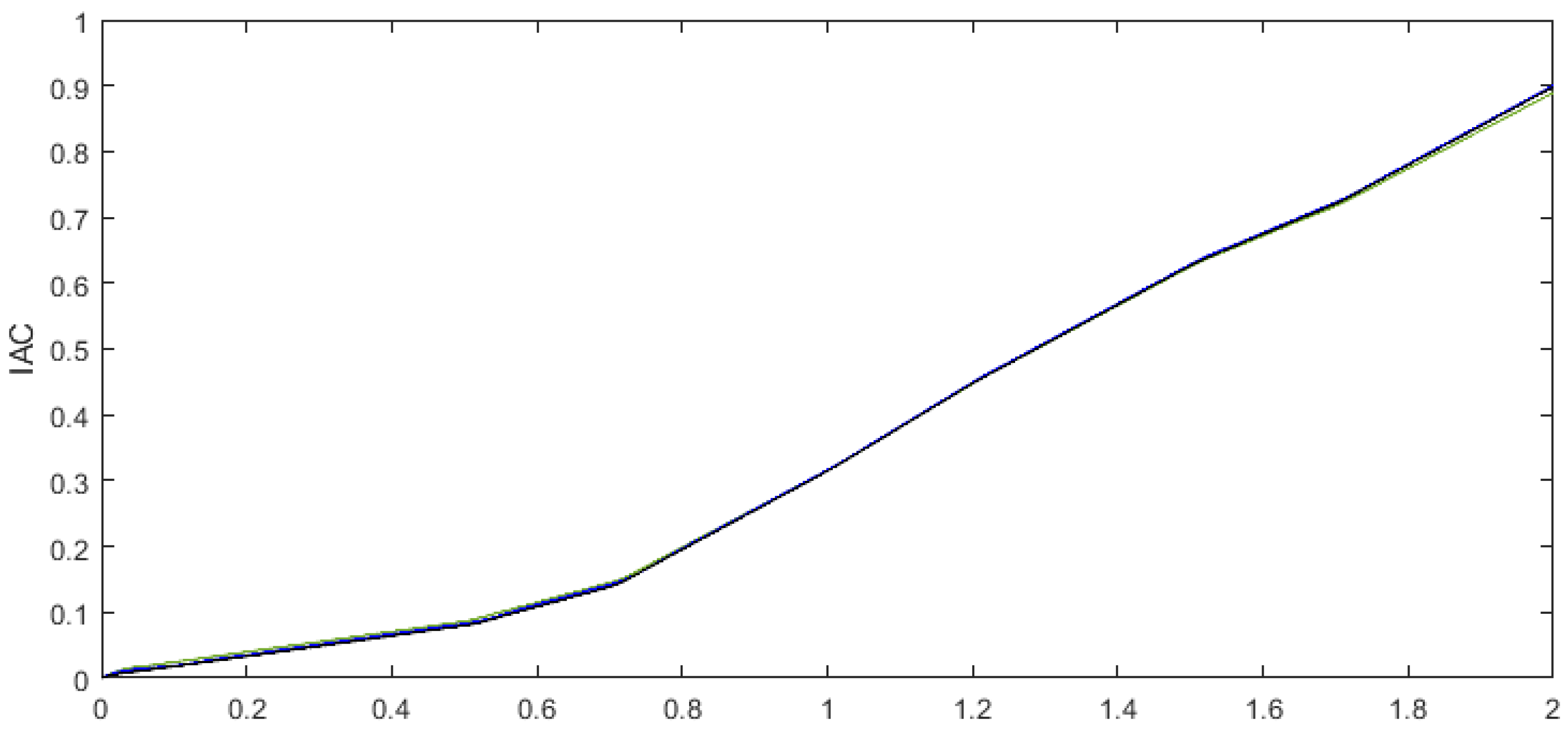 Figure 14. Comparison of the synthesized MPPT approach with respect to IAC: Black line for MPPT based on FOLQI controller, blue line for MPPT based on integer LQI controller, green line for P&O algorithm.