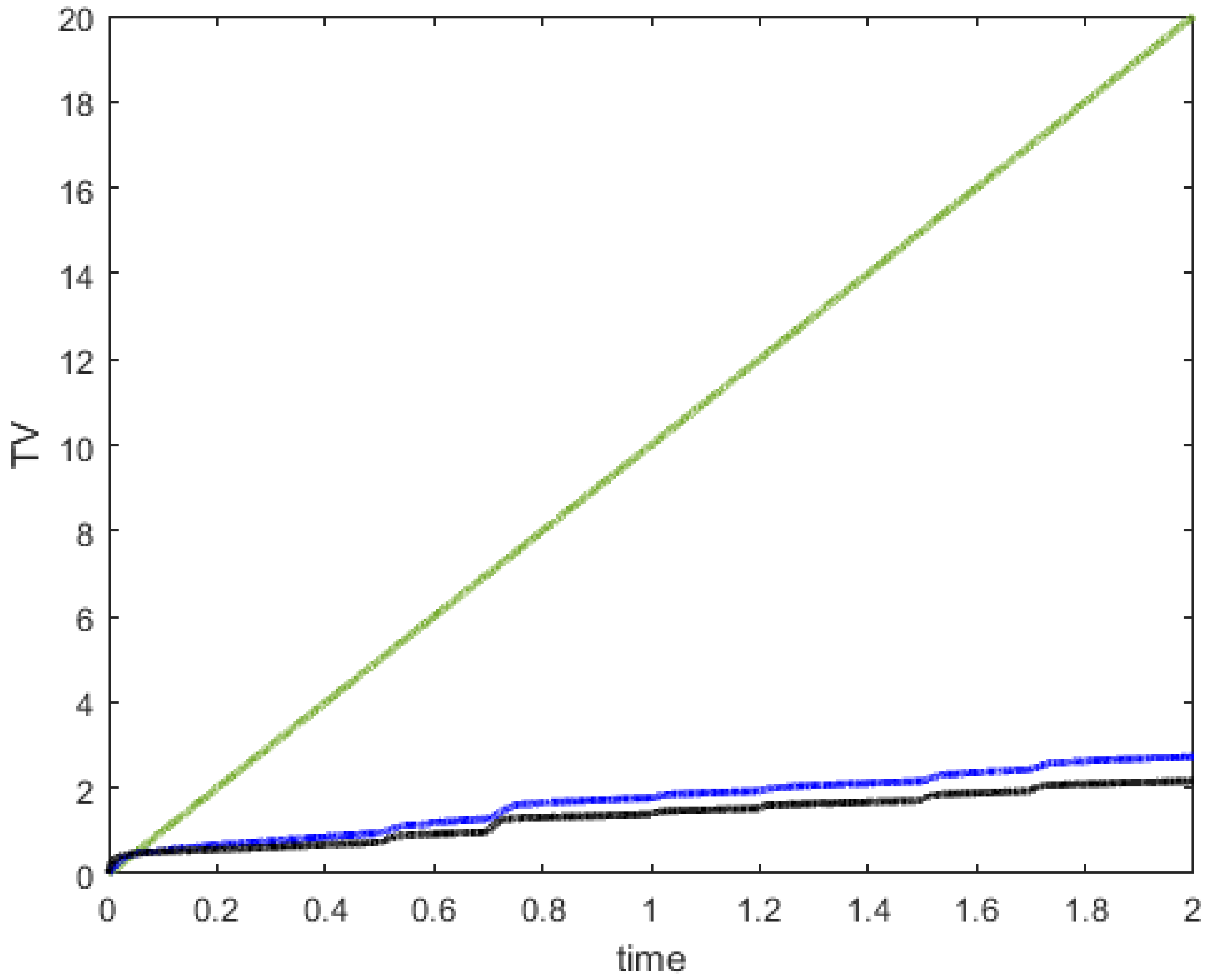 Figure 15. Comparison of the synthesized MPPT approach with respect to TV: Black line for MPPT based on FOLQI controller, blue line for MPPT based on integer LQI controller, green line for P&O algorithm.