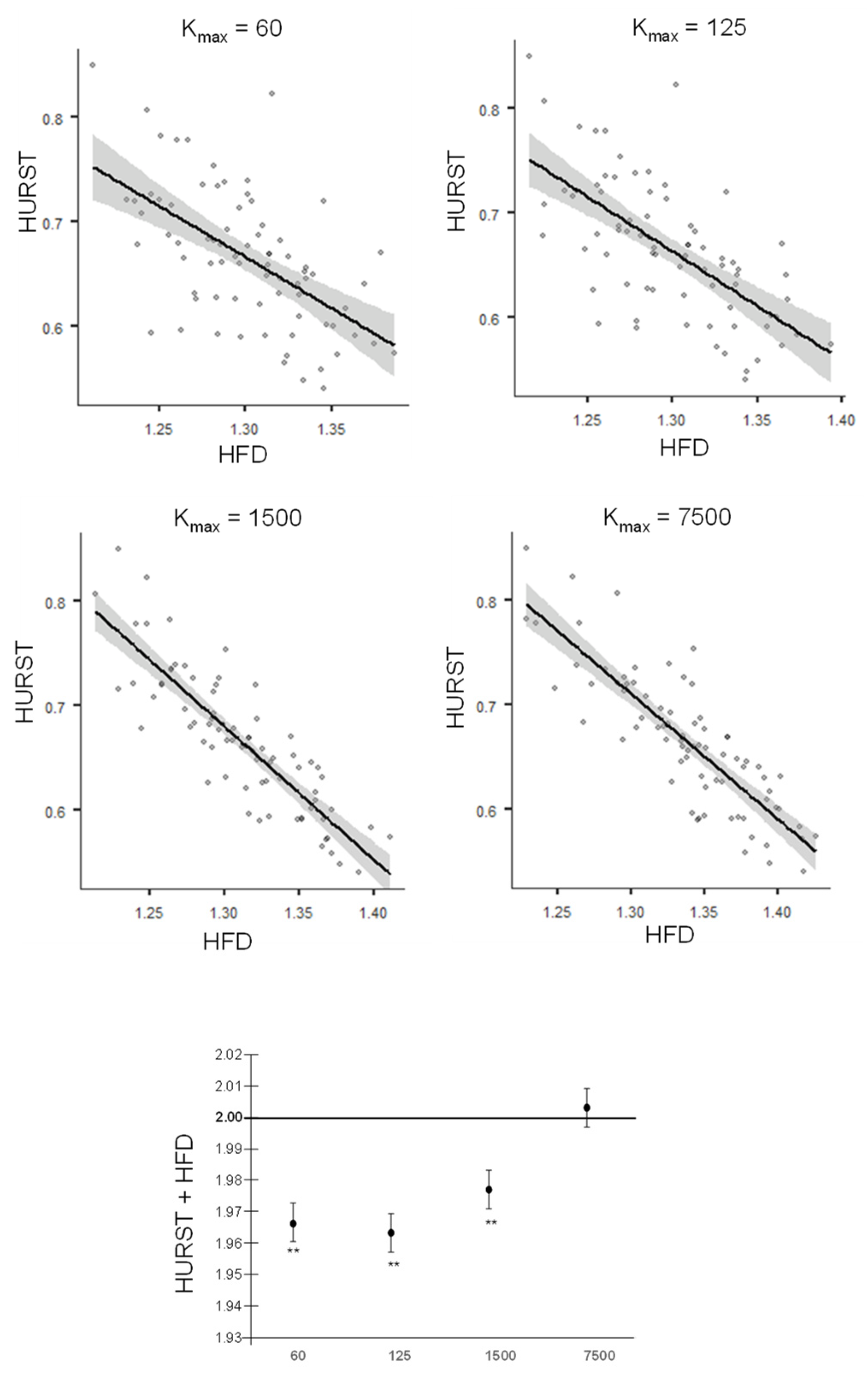 kmax is implicitly addressed by the systematic evaluation of four markedly different values spanning more than two orders of magnitude. As expected, absolute HFD values increased monotonically with