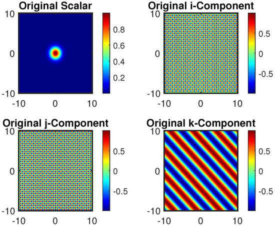 The generalization of the classical Fourier transform (FT) to the fractional Fourier transform (FRFT) [5] has significantly advanced optics and signal processing [6,7,8,9,10]. However, inherent limitations of the classical framework have motivated the development of quaternion-based methodologies. By exploiting the ability of quaternions to represent multidimensional and vector-valued data, several powerful extensions have been introduced, including the quaternion Fourier transform (QFT), the two-sided quaternion fractional Fourier transform (QFRFT) [11], and the quaternion linear canonical transform (QLCT) [12]. These transforms have demonstrated broad applicability in areas such as sampling theory, probability and statistical modeling [13], and signal denoising [14].