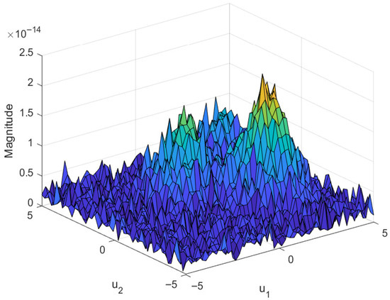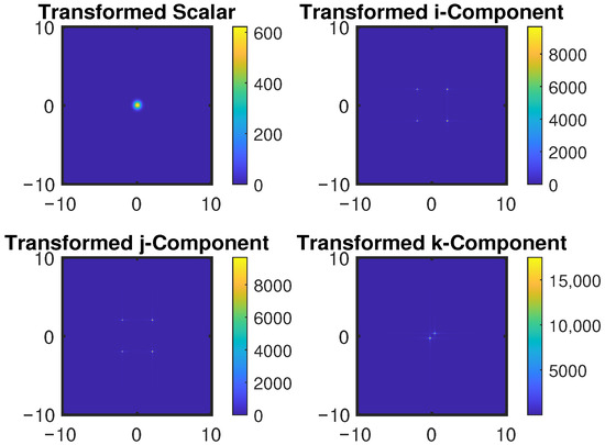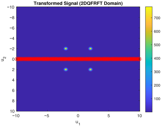 The signal is transformed using the 2D QFRFT with fractional orders and . The transformation is performed in accordance with (2). The magnitudes of the transformed signal components are calculated as: