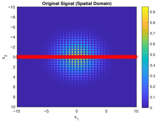 is interpreted as the restriction of a continuous function to a uniform sampling grid. Outside the sampling region, the signal is assumed to be extended by zero, which is equivalent to assuming compact support or sufficiently fast decay of f on . Under this assumption, the continuous QFRFT integrals are well approximated by finite Riemann sums. Accordingly, the continuous integrals in the definition of the 2D QFRFT are replaced by discrete summations over the sampled grid, and the transform variables are evaluated on a corresponding finite frequency grid. This discretized formulation constitutes a consistent numerical approximation of the continuous QFRFT and converges to the continuous transform as the grid resolution increases and the sampling window expands.