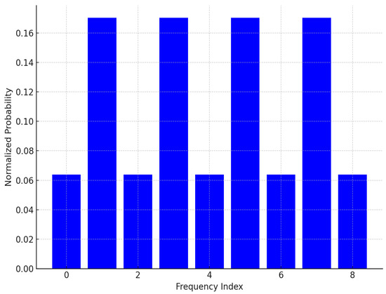 This example demonstrates the application of the 2D QFRFT to a quaternion-valued signal, highlighting fractional frequency components, normalized probabilities, and energy distribution in the transform domain. As shown in Figure 5, the normalized probabilities represent the relative magnitudes of these components. Peaks indicate dominant spectral elements and reveal the signal’s energy distribution, while smaller values correspond to less significant contributions.