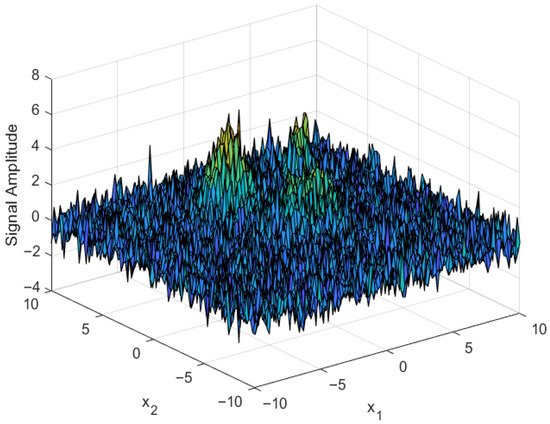 Consider the following 2D radar signal representing targets at specific positions and noise distributed across the domain: