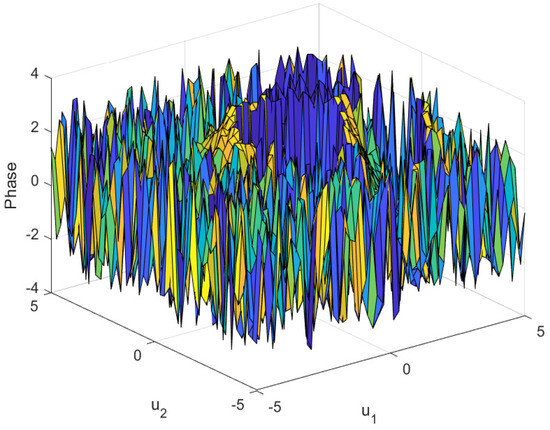 where . The signal is transformed using the 2D QFRFT with fractional orders and . The graphs generated in Figure 3 and Figure 4 show: