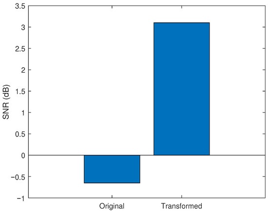 Figure 9 is dealing with the signal from Example 3. It is comparing the original SNR of the noisy radar signal with the transformed SNR, highlighting how the 2D QFRFT concentrates the signal’s energy and disperses noise in the transform domain.