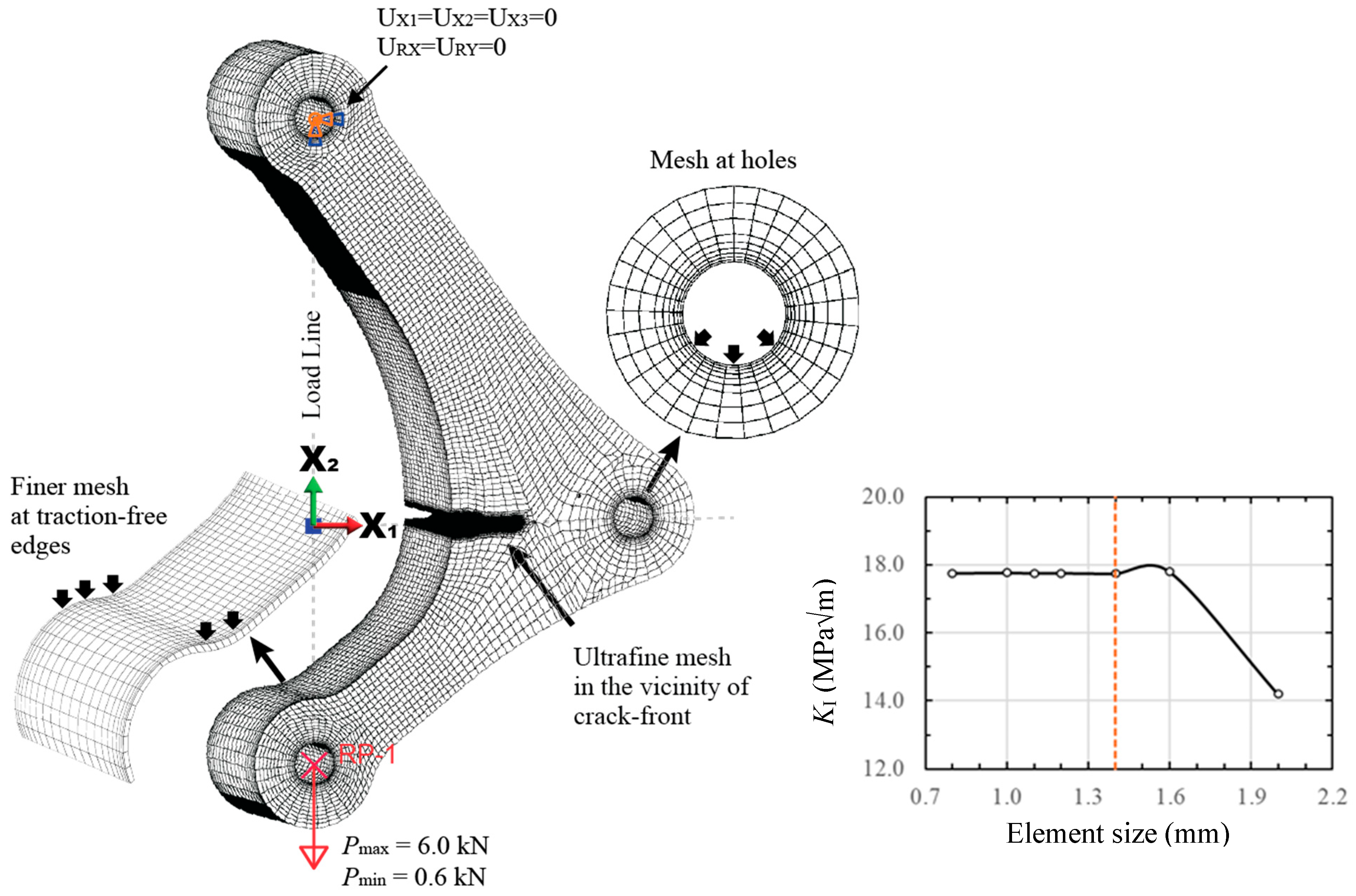 - The fatigue crack in the bell crank structure is driven by a combined Mode-I (opening) and Mode-II (shearing) crack-tip loading along a curved crack-path trajectory, as dictated by the asymmetric stress distribution.