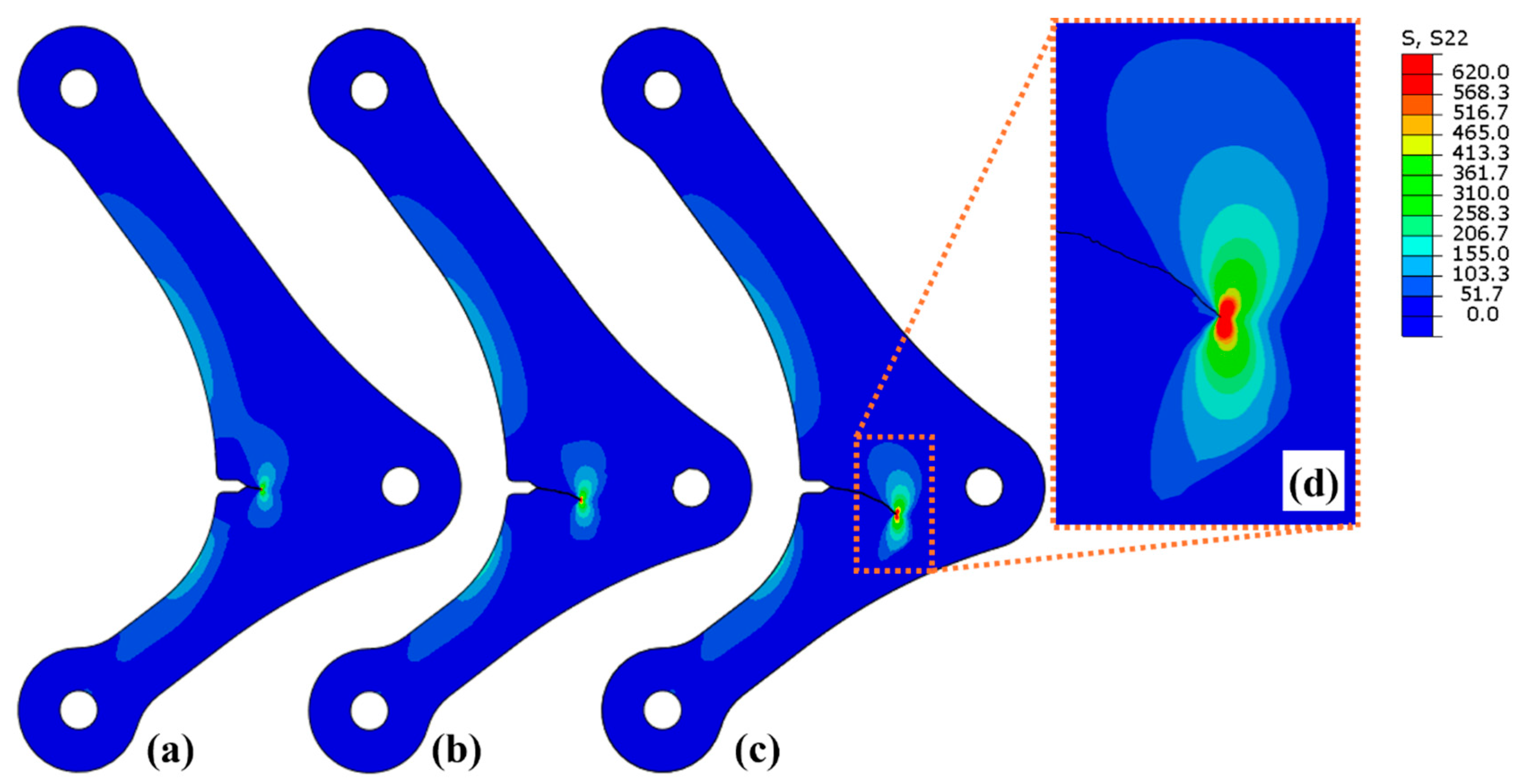 - Chen, Z.; Dai, Y.; Liu, Y. Structural fatigue crack propagation simulation and life prediction based on improved XFEM-VCCT. Eng. Fract. Mech. 2024, 310, 110519. [Google Scholar] [CrossRef]