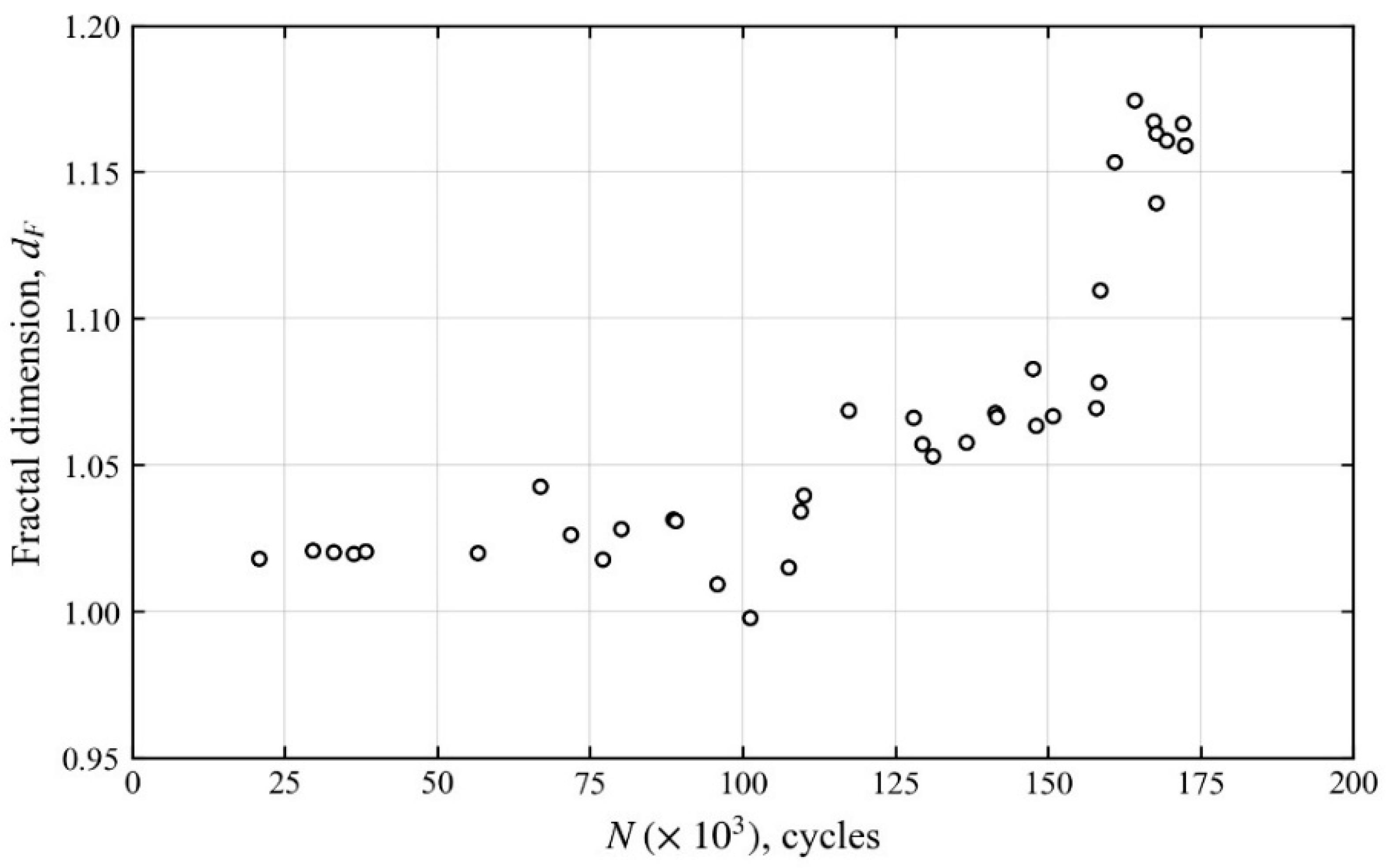 - Hashmi, M.H.; Abdul-Hamid, M.F.; Abdul-Latif, A.; Tamin, M.N.; Khattak, M.A. Fractal Dimensions of a Propagating Fatigue Crack in Metallic Materials. J. Fail. Anal. Prev. 2021, 21, 1644–1651. [Google Scholar] [CrossRef]