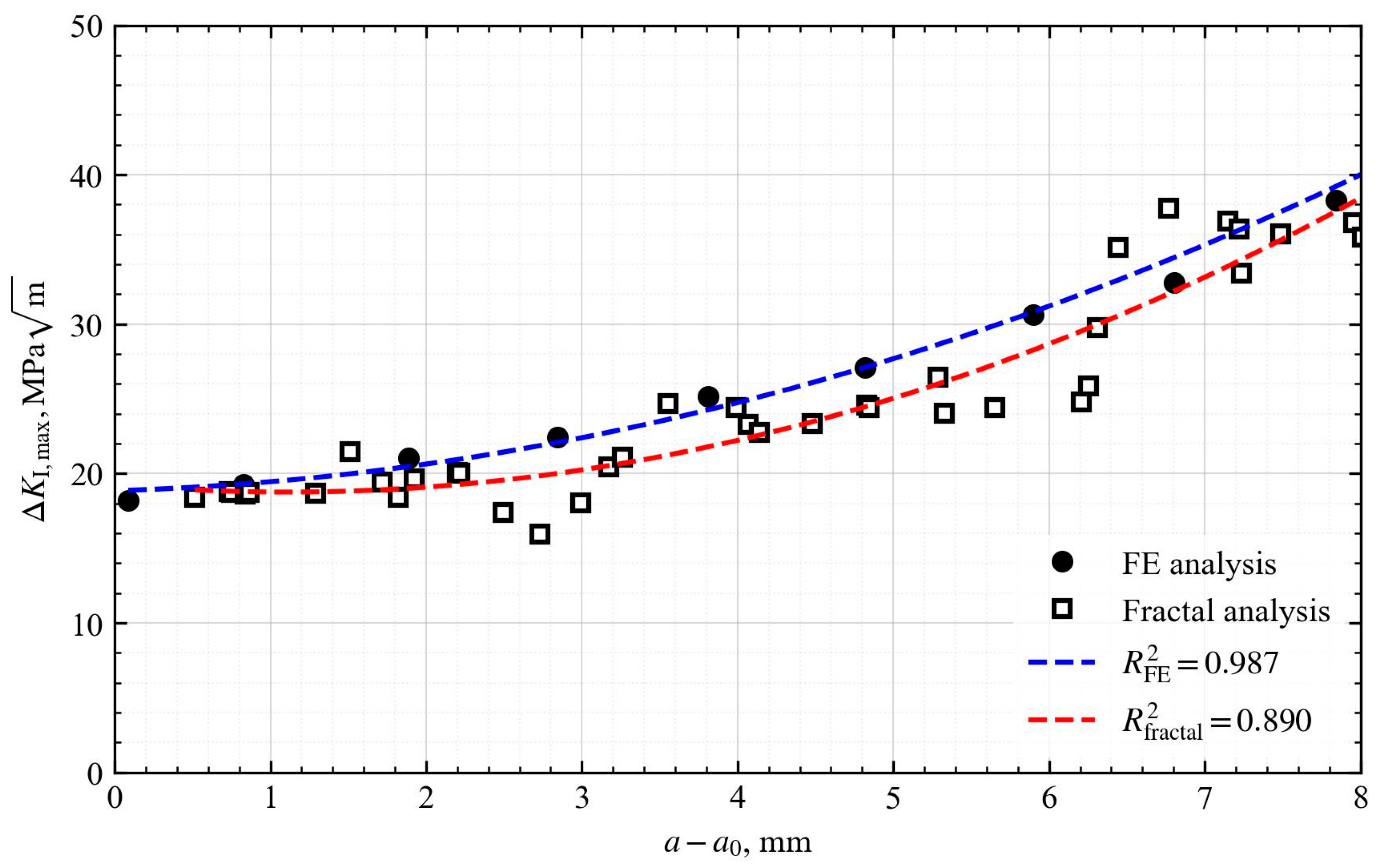- Hashmi, M.H.; Koloor, S.S.R.; Abdul-Hamid, M.F.; Tamin, M.N. Exploiting fractal features to determine fatigue crack growth rates of metallic materials. Eng. Fract. Mech. 2022, 270, 108589. [Google Scholar] [CrossRef]