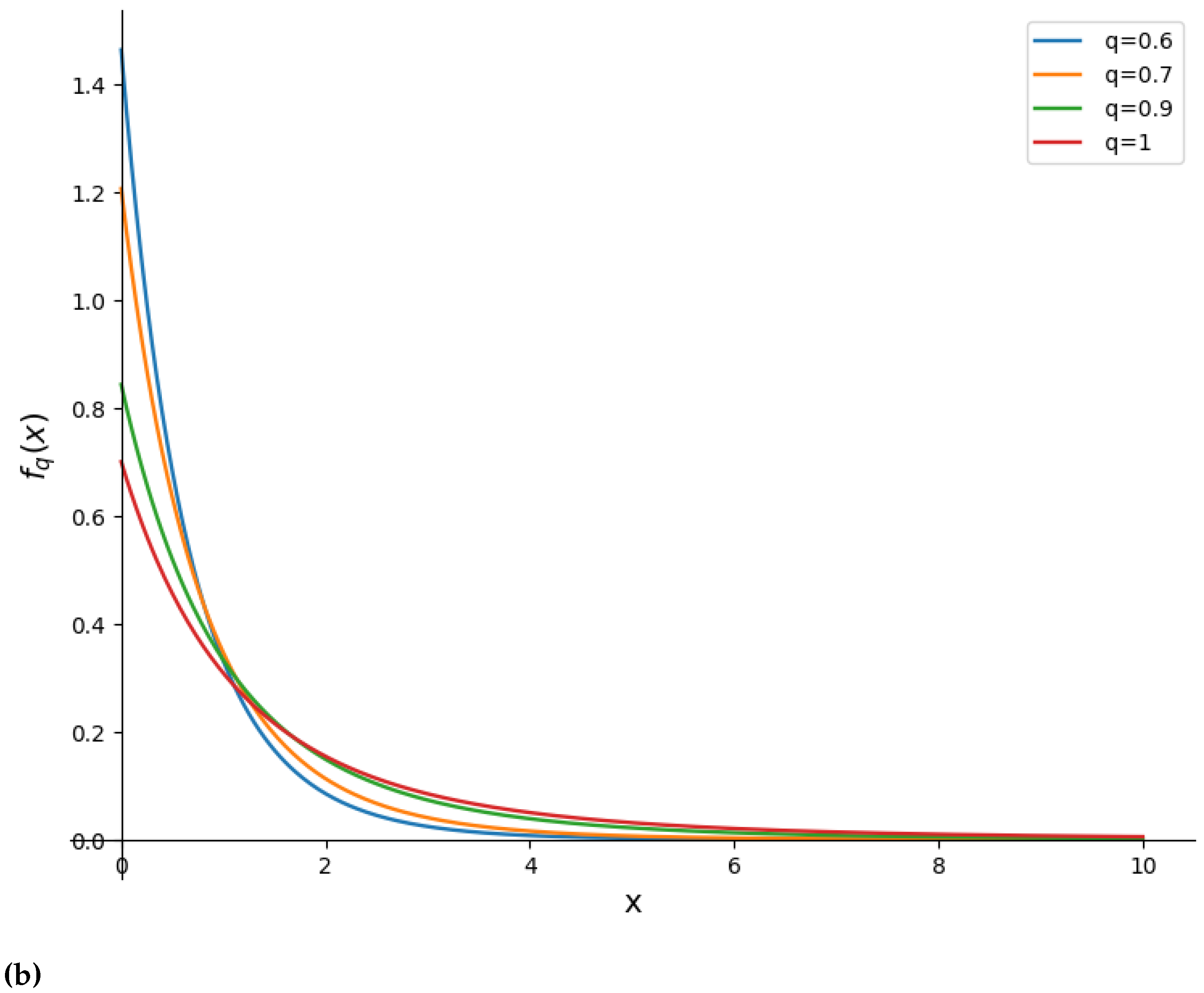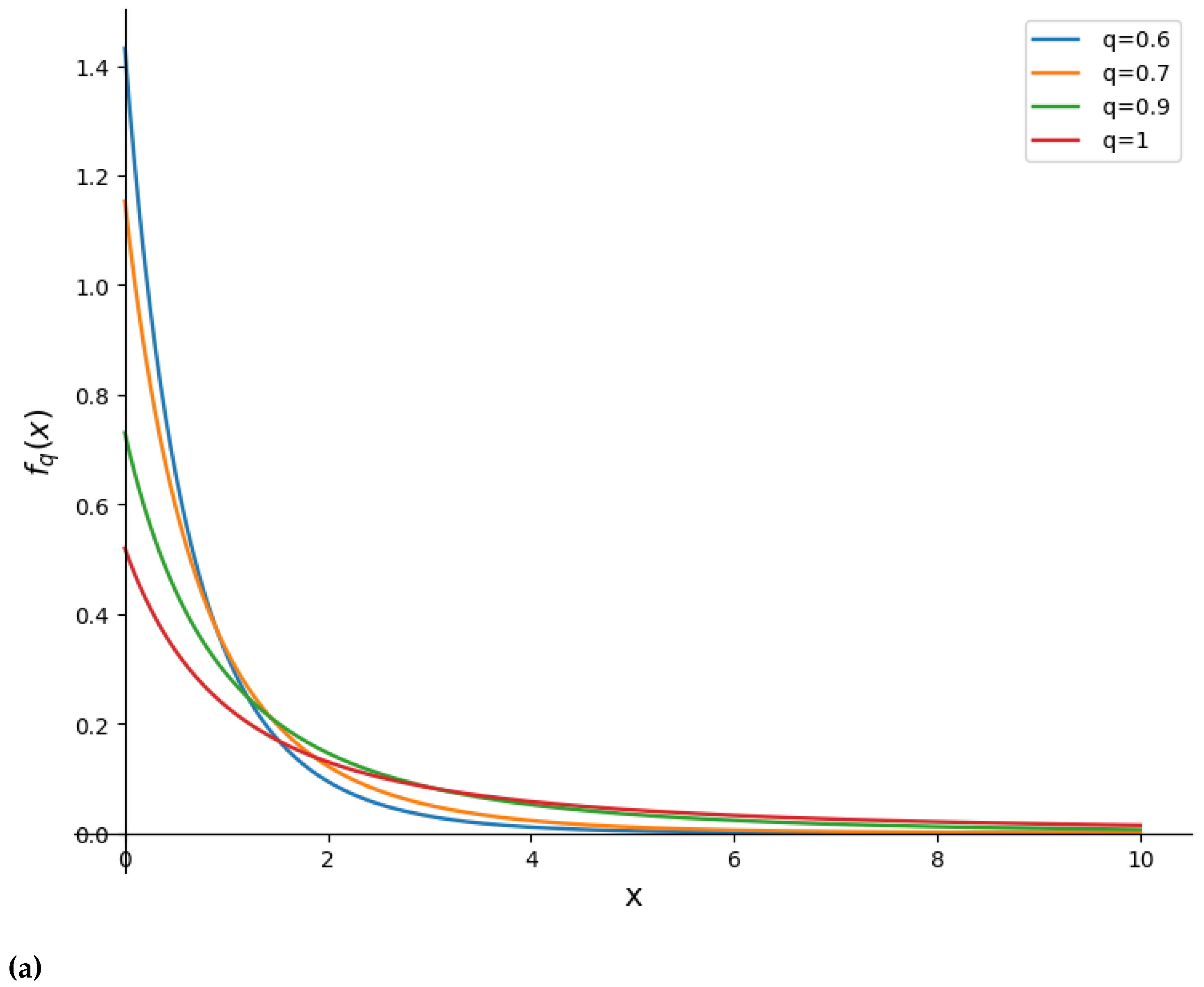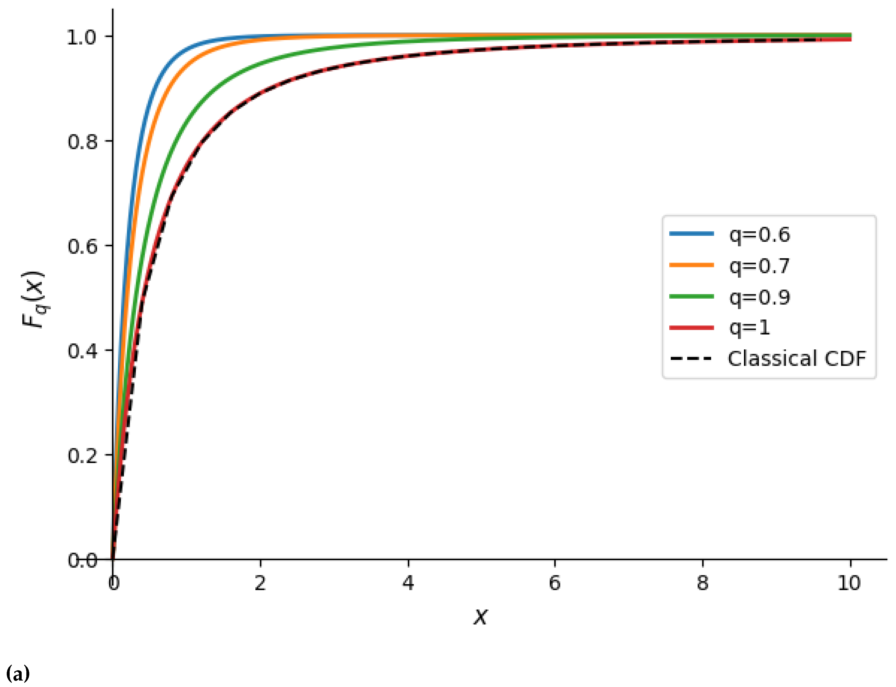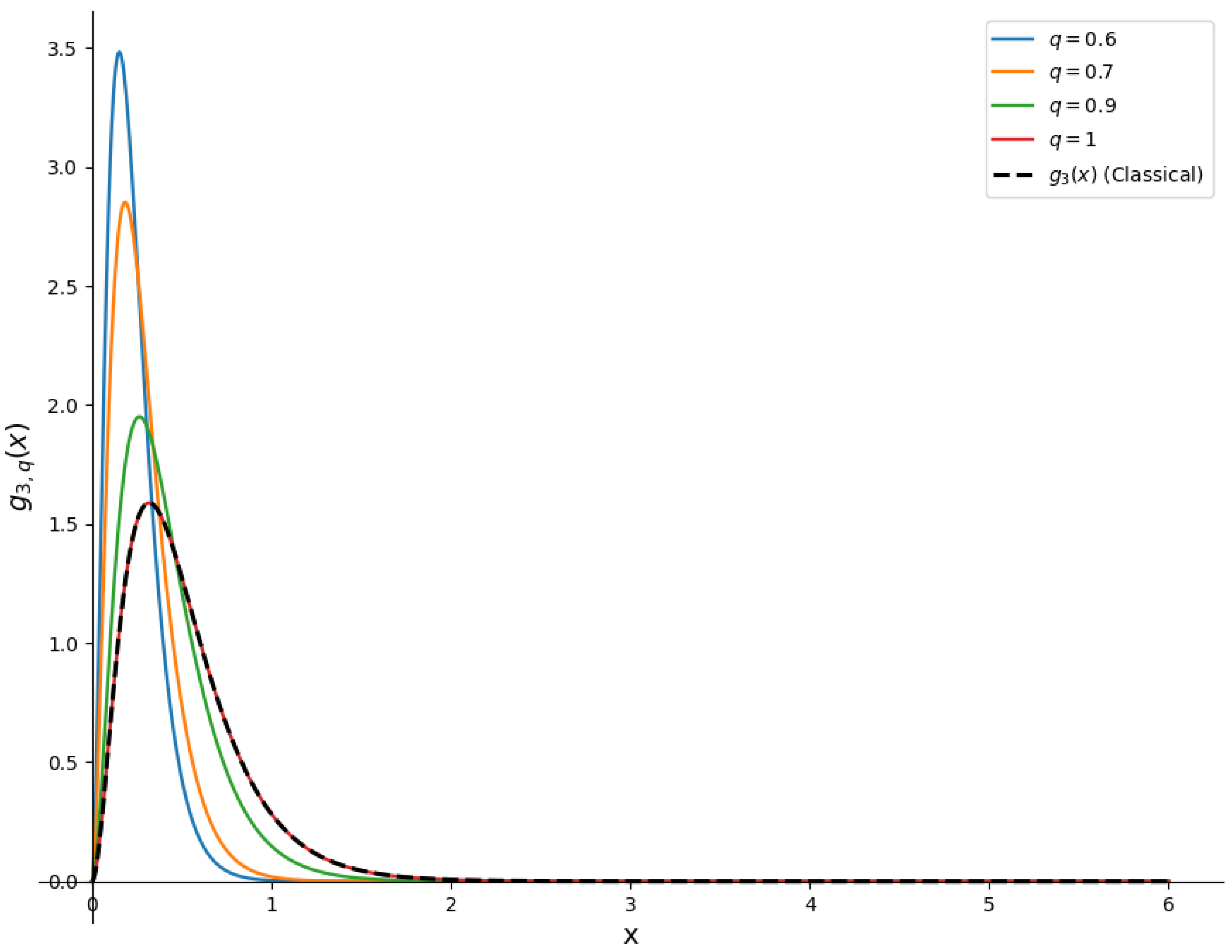 Remark 1. The normalizing constant in (8) involves the upper incomplete Gamma function . For and , the second argument of the Gamma function is strictly positive; in addition, the first argument may take any real value and therefore no additional restriction on the parameters of the UDF q-LD is required. For more details about the incomplete gamma function, see [11]. Proposition 1. As the fractional parameter , the UDF-PDF reduces to the classical LD: Proof. We can equivalently write