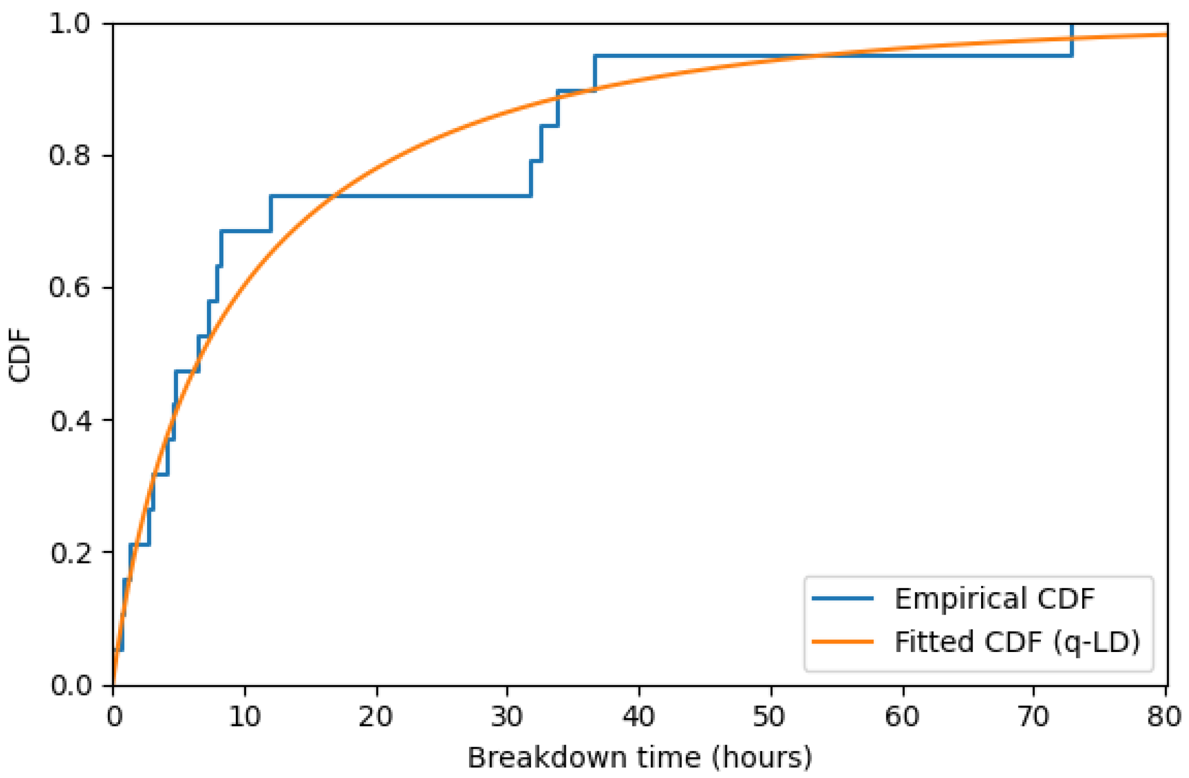 aligns closely with the empirical CDF of the breakdown-time data over the full support, especially in the upper tail, indicating an excellent fit; see