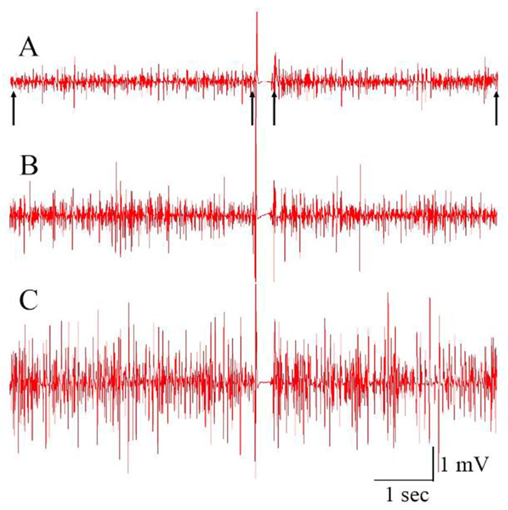 Figure 3 shows the raw signal recorded at three different contraction levels from the FDI muscle, studied in this particular research project with TMS application.
