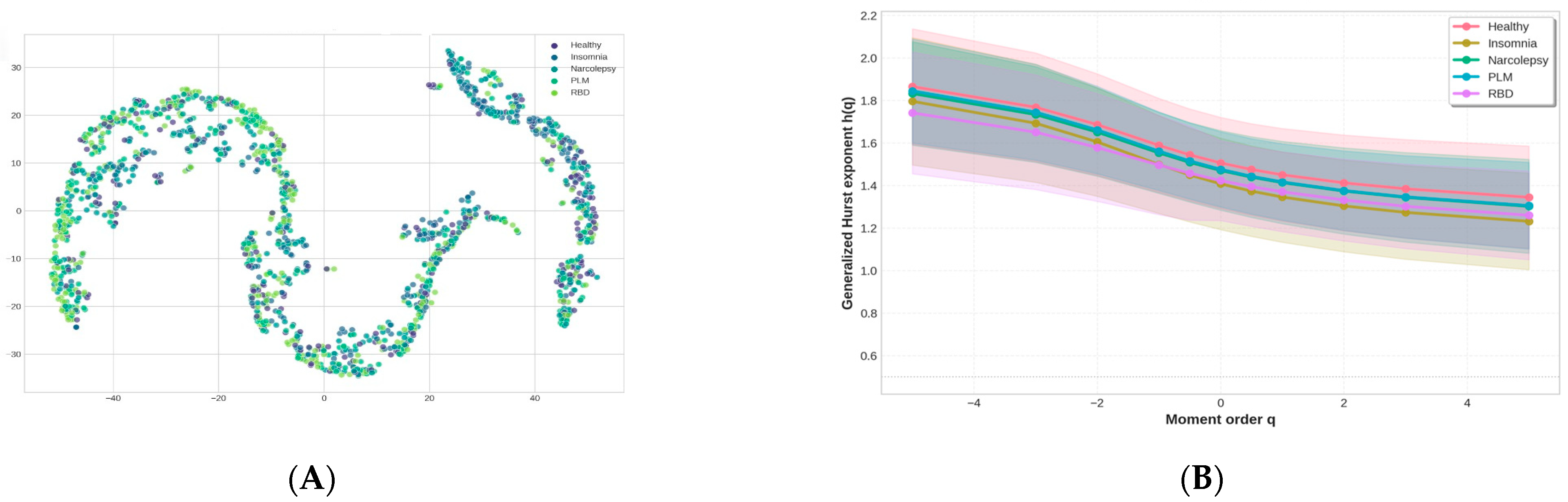 The discriminative power of MF-DFA features was evaluated via the generalized Hurst exponent h (q = 1) on the CAP test set: Healthy = 0.72(0.08), Insomnia = 0.65(0.09), Narcolepsy = 0.58(0.11), PLM = 0.69(0.10), and RBD = 0.67(0.10). Lower h(1) in Narcolepsy reflects fragmented sleep, while higher values in Healthy indicate more stable EEG dynamics, consistent with class separation observed in the t-SNE (