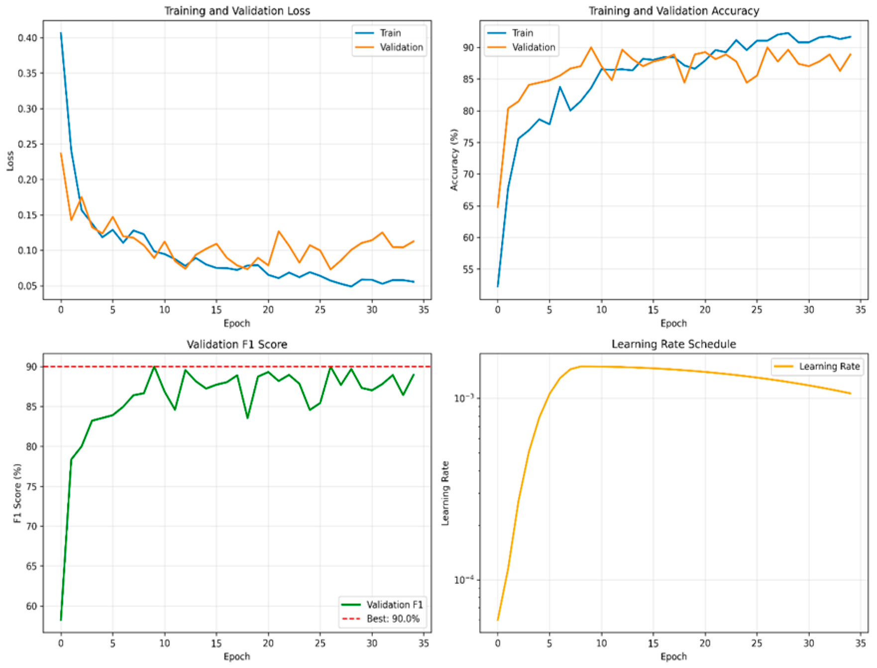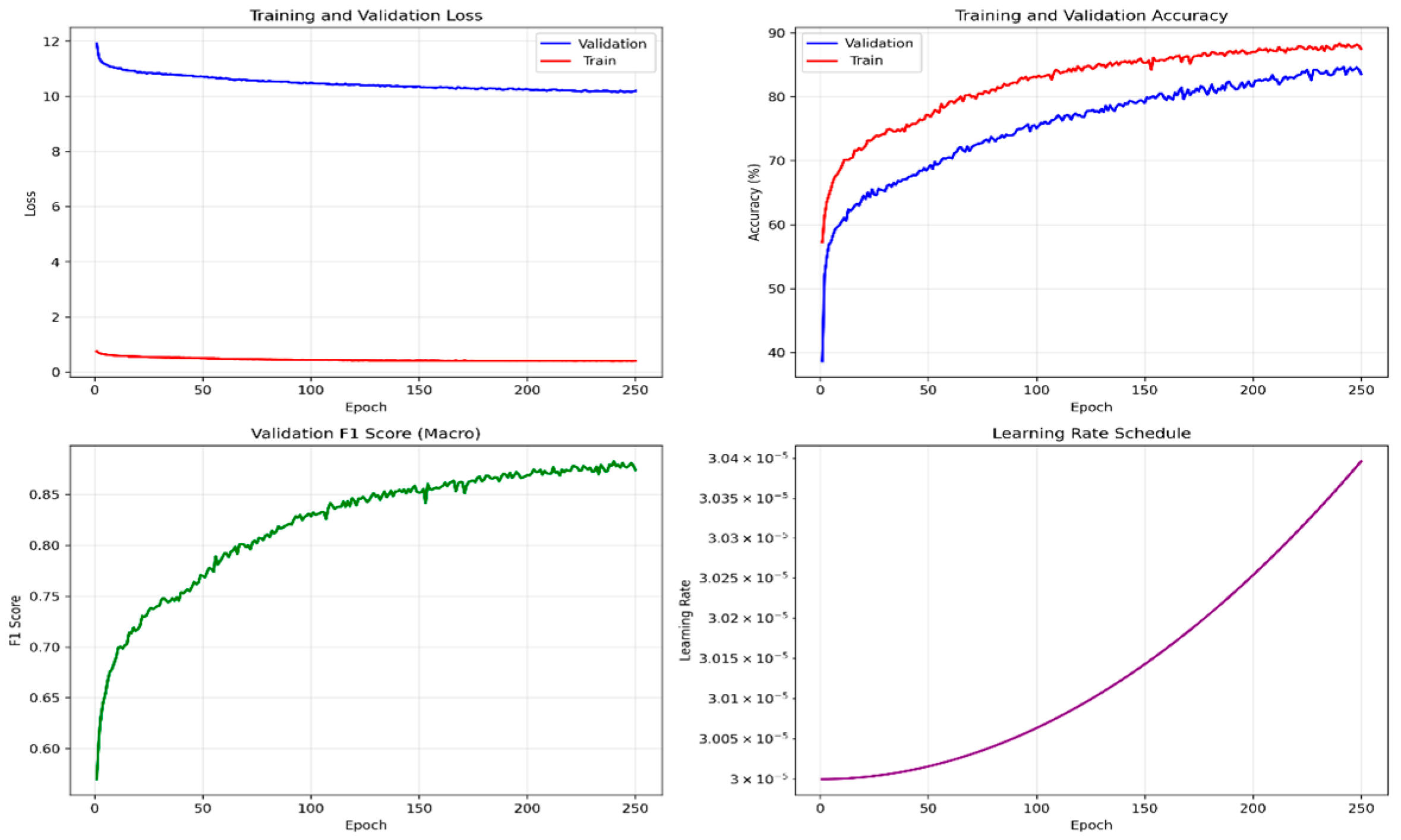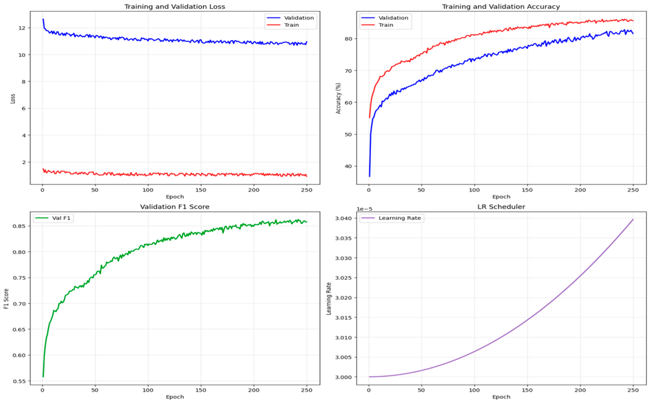 Figure 6. The training loss decreased from approximately 12 to 1 over 250 epochs, while the validation loss stabilized near 1, indicating mild overfitting yet preserved generalization. The system achieved training accuracy of approximately 85.12% and validation accuracy of 82.14%, while the F1-score improved from 0.55% to 0.8616%, demonstrating equal precision in measuring results and detecting items. The learning rate changed from 0.001 to 0.004 during the training process. The system exhibited minor overfitting, yet the validation results showed successful feature extraction because they created a reference point to assess the added value of MF-DFA features.