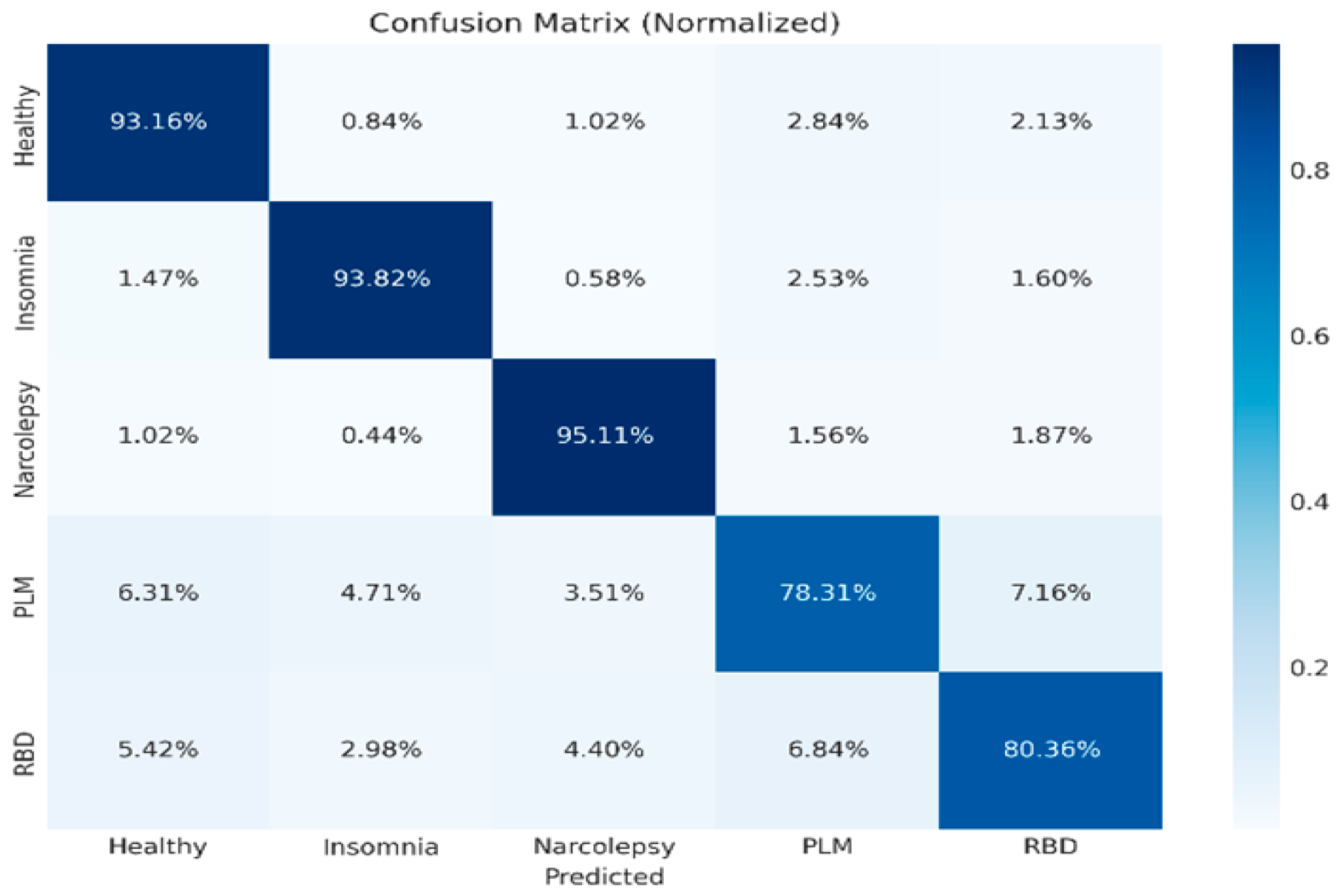 Figure 5. The highest level of accuracy was 93.82% in Insomnia. Narcolepsy had a recall of 95.11%. The bidirectional PLM–RBD confusion rates (7.16% and 6.84%) coincided with the epidemiological findings of 30–60% PLM prevalence in patients with RBD, which suggests similar motor manifestations to be verified by electromyography.