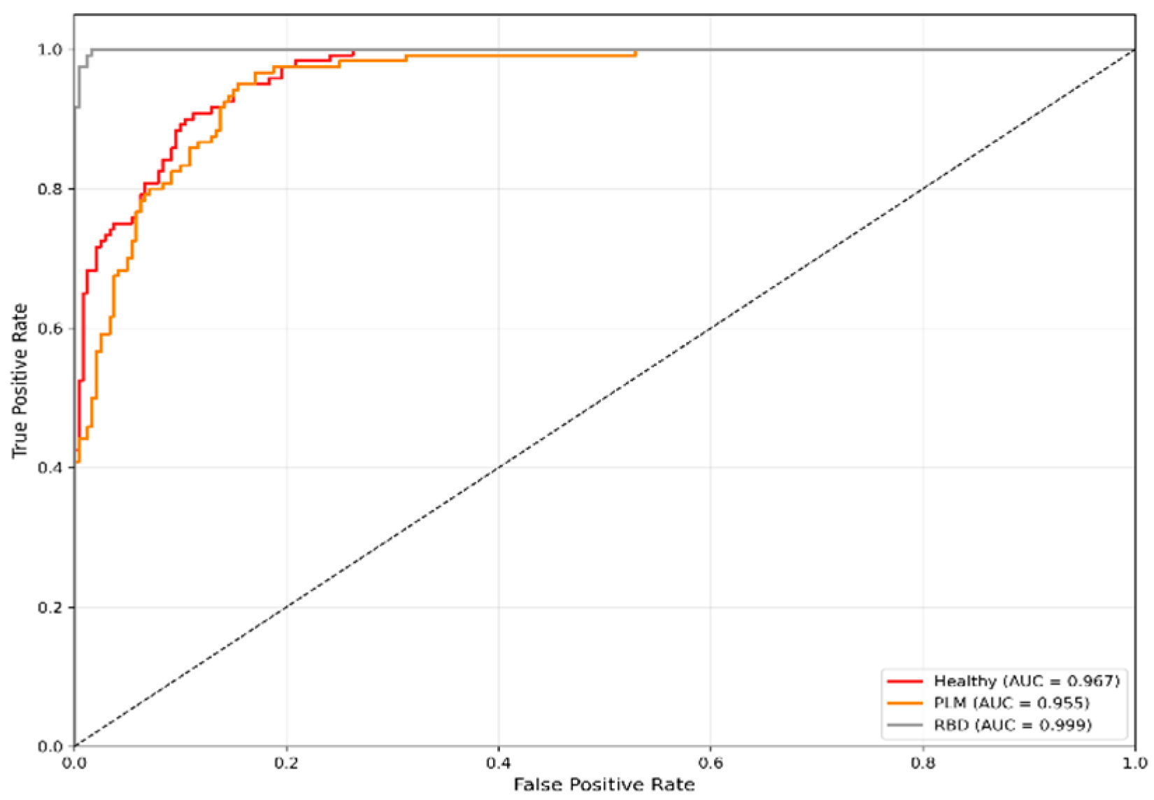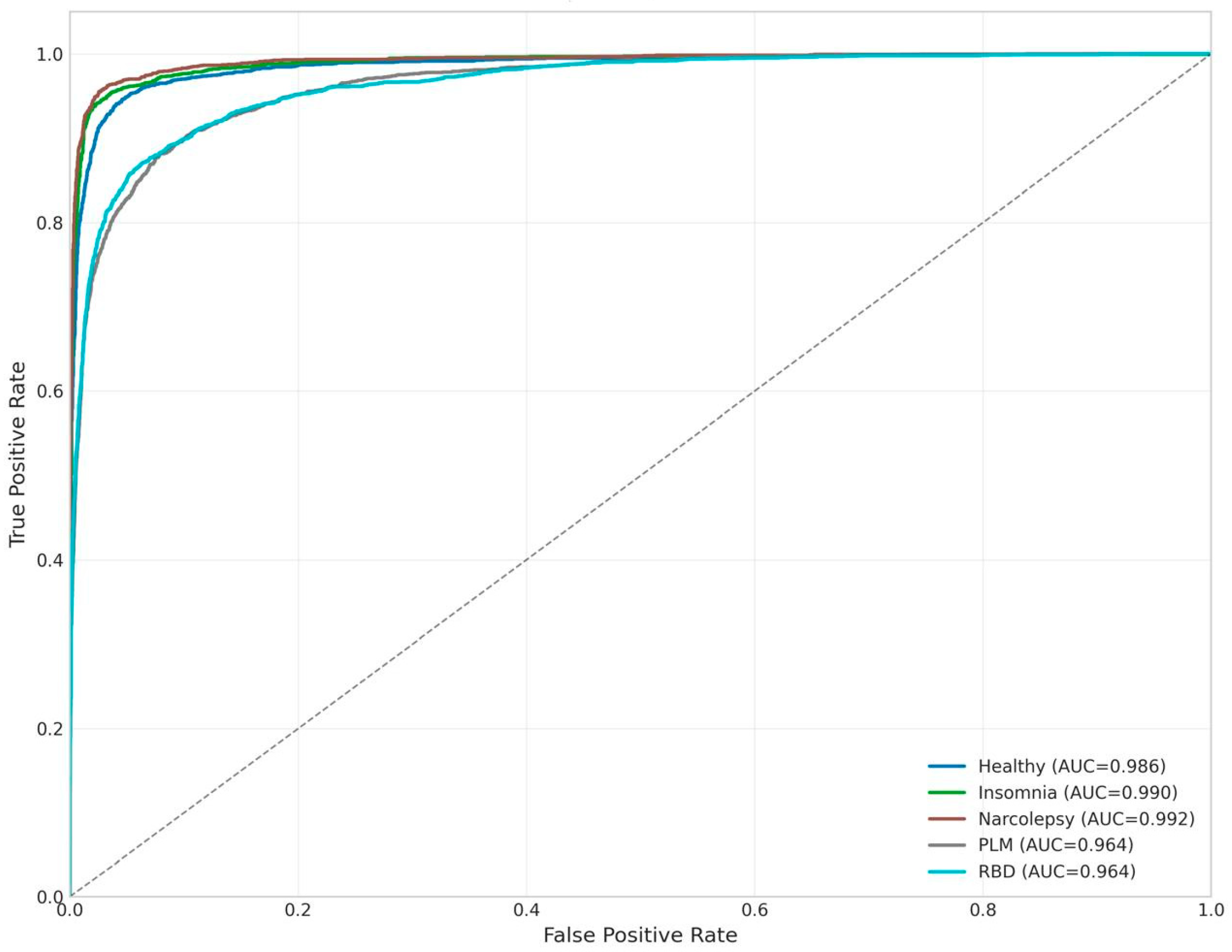 The testing results showed a macro F1 score of 88.02%, a weighted F1 score of 86.40%, and a Cohen’s Kappa value of 0.8519, which demonstrated a strong capacity to manage class imbalance on the CAP test set. The multiple classification system achieved strong performance with a 0.8298 MCC score, which showed effective distinction between multiple classes, while class-wise AUC values ranged from 0.964 for PLM and RBD to 0.992 for Narcolepsy, as shown in