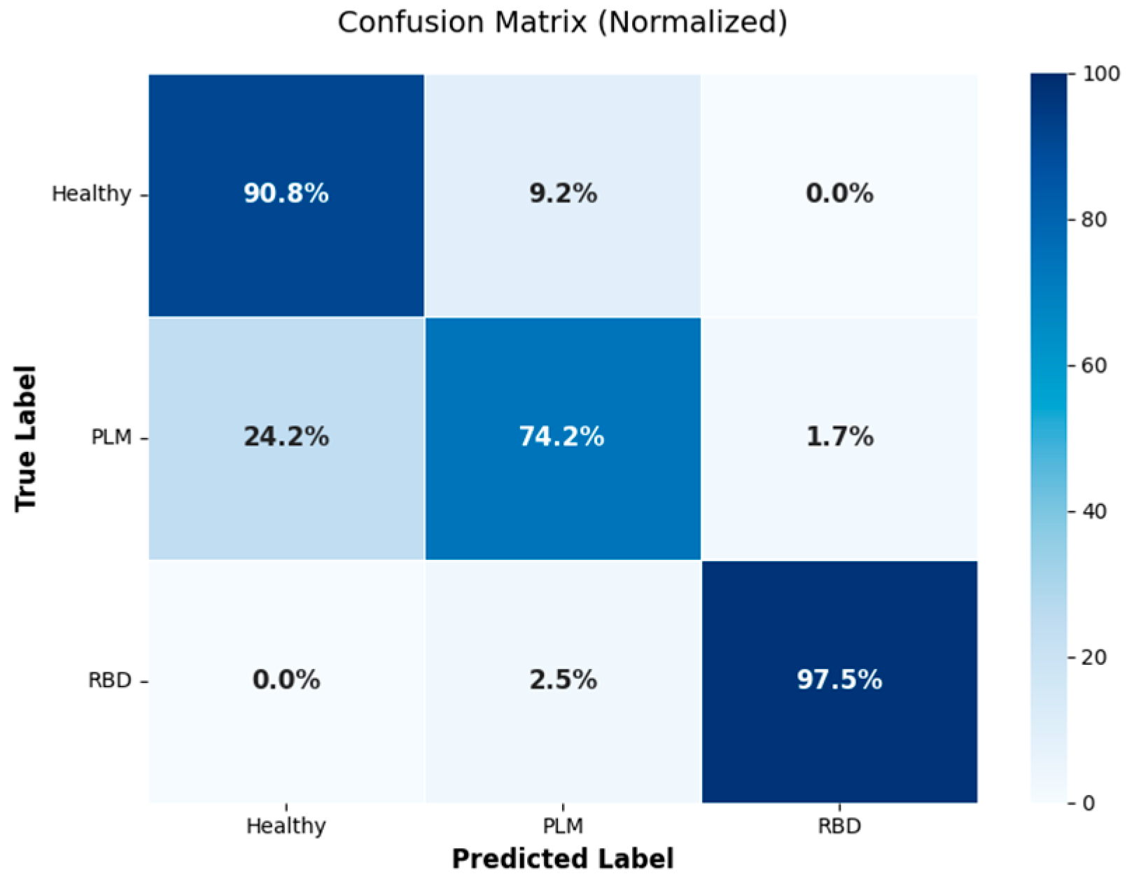 The analysis of the confusion metrics revealed that Healthy was the one with the true positive rate of 93.16%, with the major confusions being to PLM of 2.84% and to RBD of 2.13%, as shown in