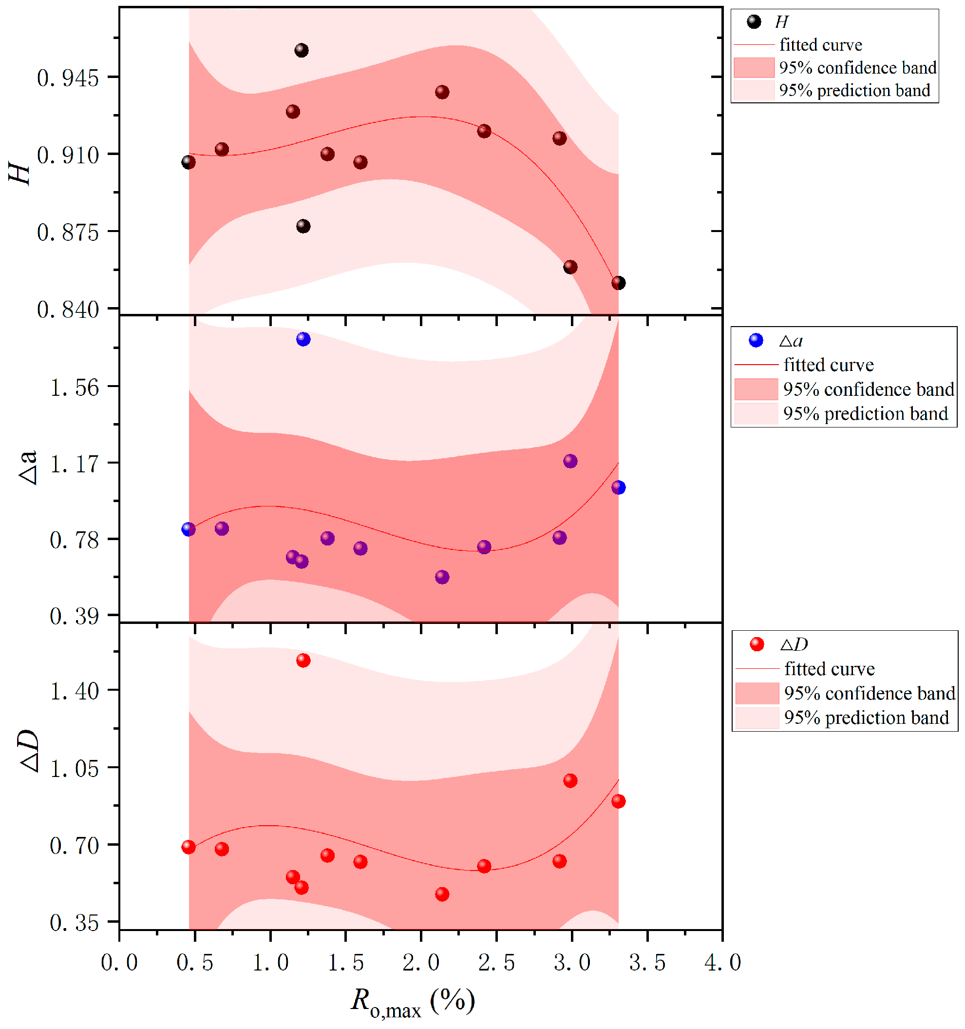 - Micropores in coal of different ranks all display pronounced multifractal characteristics. Their fractal dimension spectrum assumed an inverted S shape, while the singularity spectrum exhibited a convex parabolic shape. The width of the fractal dimension spectrum ΔD and the singularity spectrum width Δα first increased, then decreased, and finally increased again with increasing Rₒ,max, whereas the Hurst index H first increased and then decreased, exhibiting an opposite trend to those of PV and SSA. The values of ΔD, Δα, and H can be used to quantitatively characterize the heterogeneity and connectivity of the pore structure.