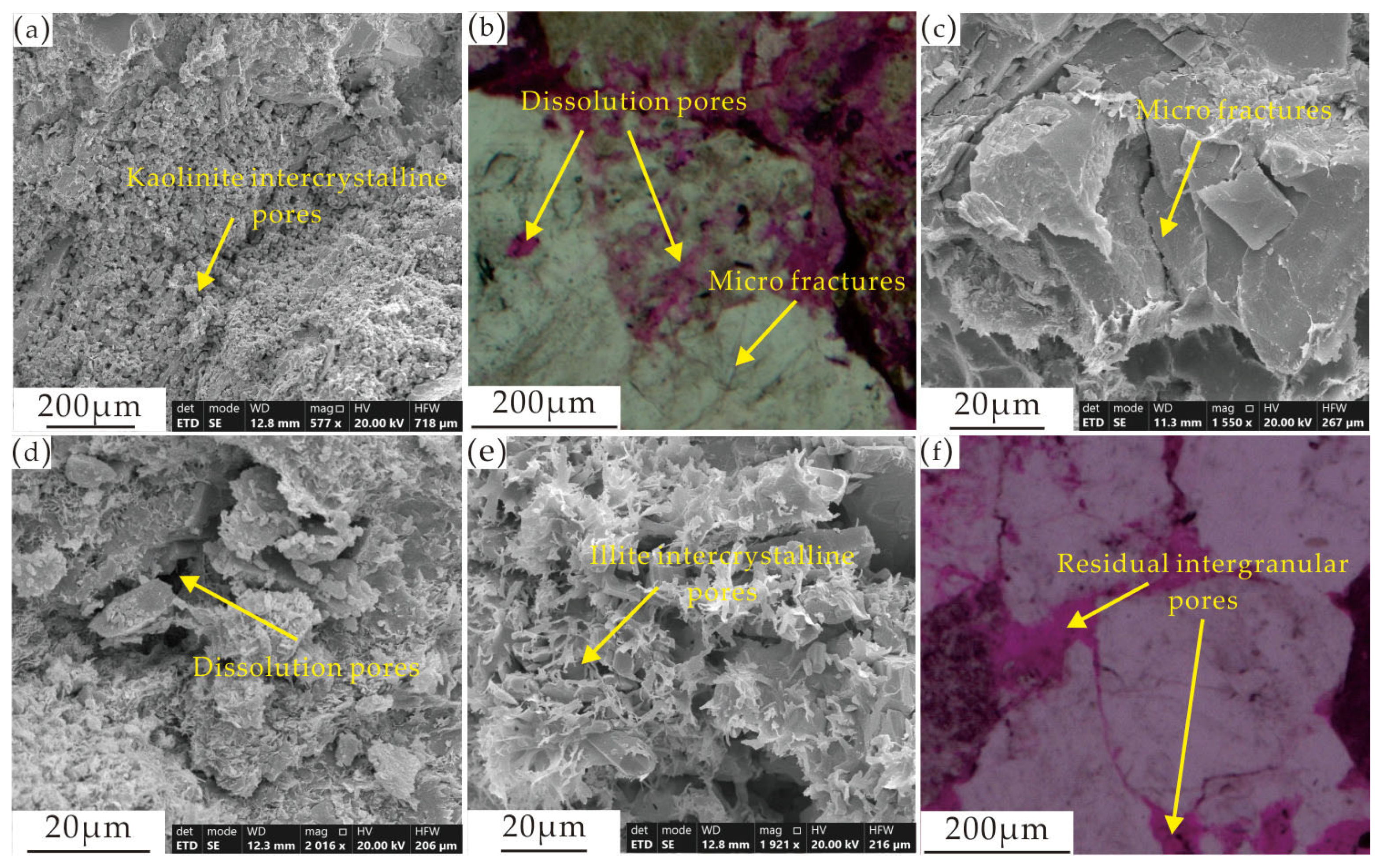 - Wang, Z.; Liu, Y.; Lu, S.; Lin, L.; Zhou, N.; Liu, Y. Differential development characteristics of secondary pores and effects on pore structure and movable fluid distribution in tight gas sandstones in the lower Permian, northeastern Ordos Basin, China. Geoenergy Sci. Eng. 2023, 224, 211580. [Google Scholar] [CrossRef]