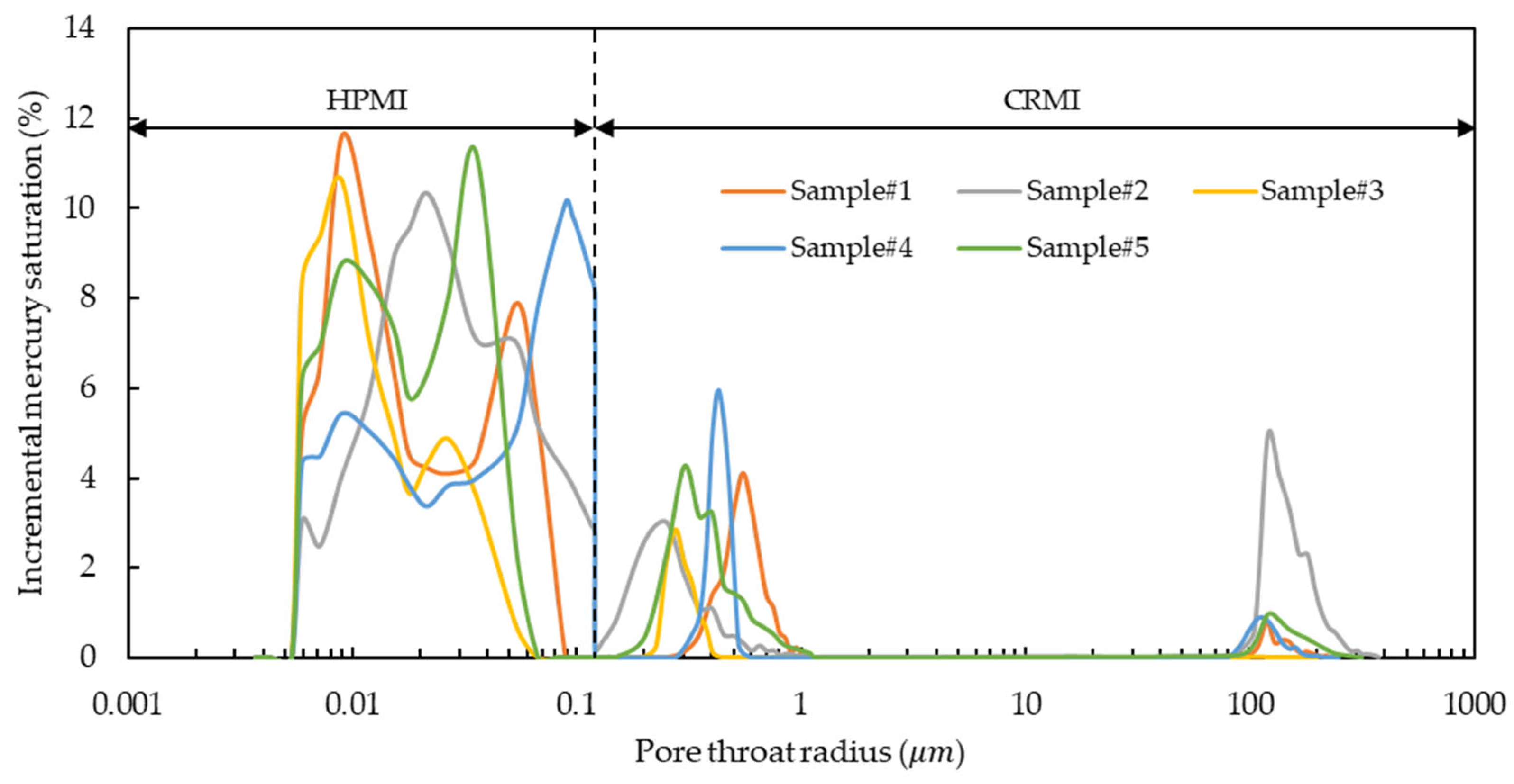 - Wu, Y.; Liu, C.; Ouyang, S.; Luo, B.; Zhao, D.; Sun, W.; Awan, R.S.; Lu, Z.; Li, G.; Zang, Q. Investigation of pore-throat structure and fractal characteristics of tight sandstones using HPMI, CRMI, and NMR methods: A case study of the lower Shihezi Formation in the Sulige area, Ordos Basin. J. Pet. Sci. Eng. 2022, 210, 110053. [Google Scholar] [CrossRef]