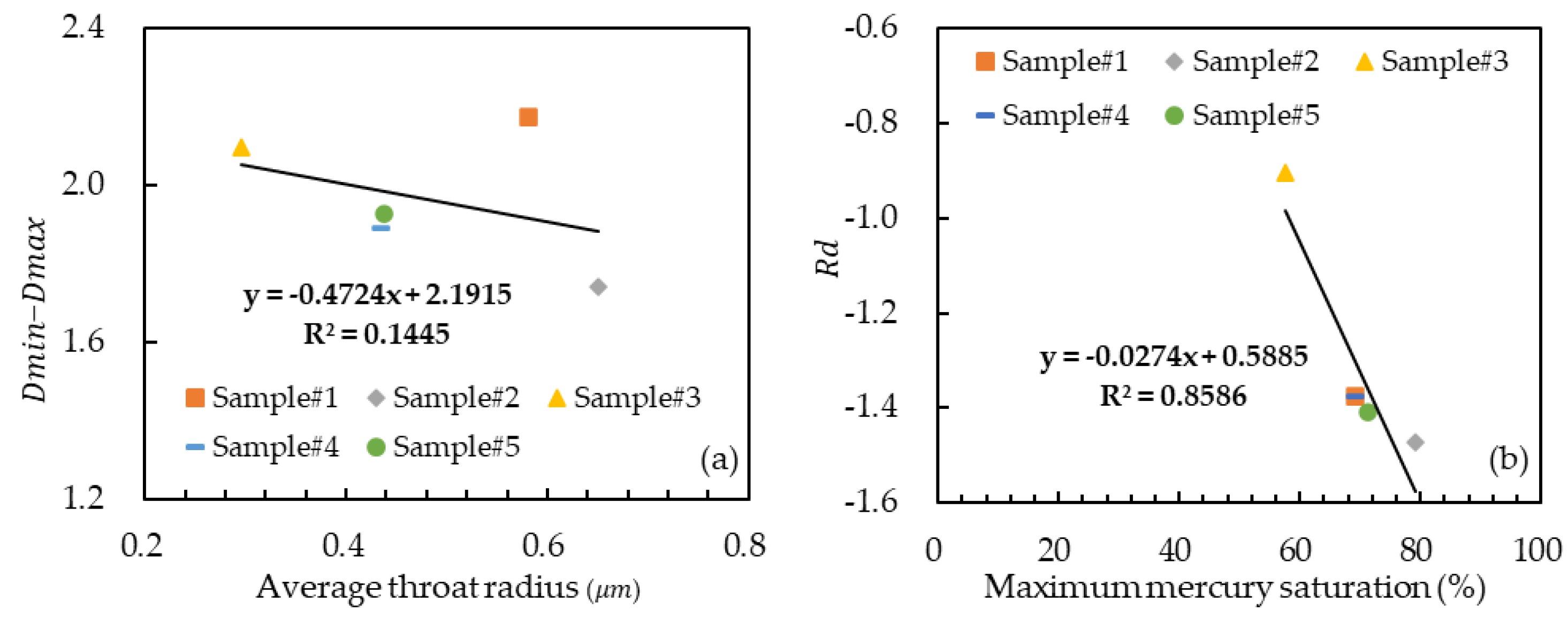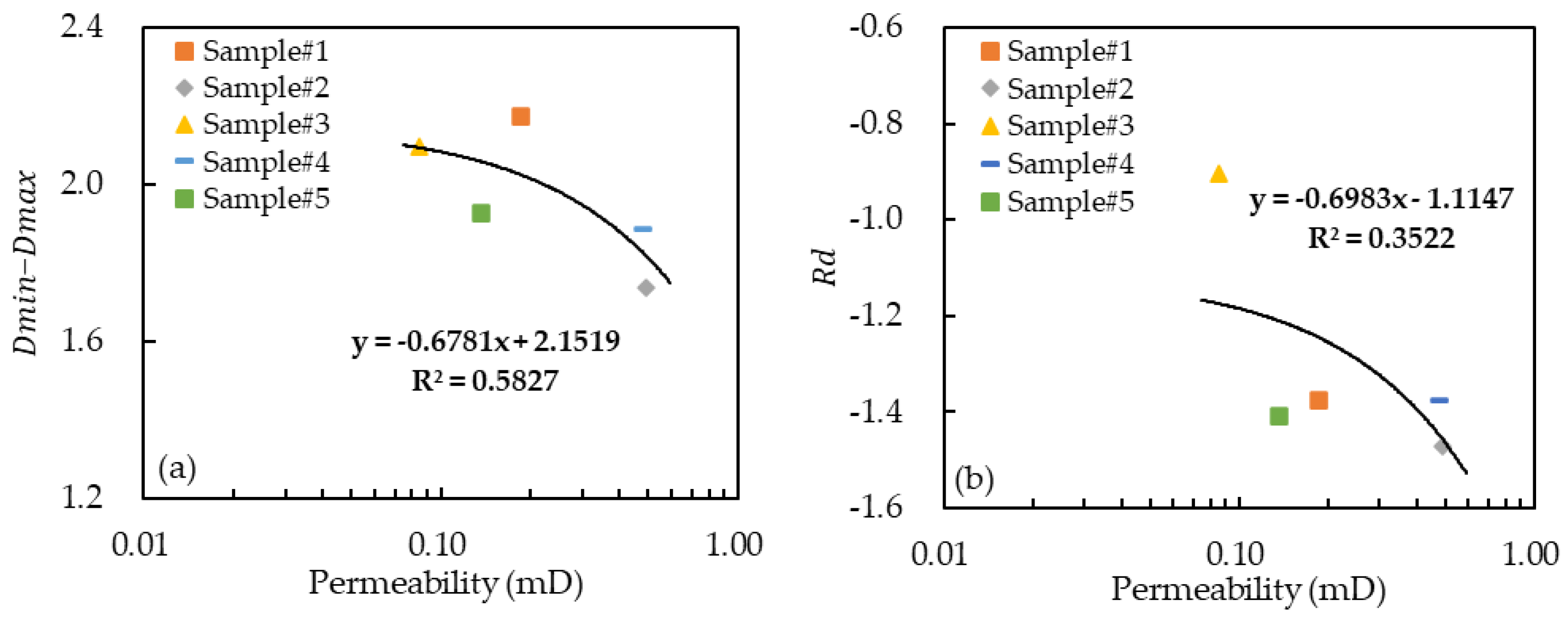 - Zhou, Y.; Han, G.; Liu, Y.; Mou, L.; Wang, K.; Yang, P.; Yan, K. Fractal Characteristics and Controlling Factors of Pore-Throat Structure in Tight Sandstone Reservoirs: A Case Study of the 2nd Member of the Kongdian Formation in the Nanpi Slope, Cangdong Sag, Bohai Bay Basin. Fractal Fract. 2025, 9, 608. [Google Scholar] [CrossRef]