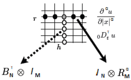 We can arrange all the numerical values of the solution in a matrix, which contains the numerical results of every discretized value of time and space. Such a matrix represents the iteration matrix which yields the discretization vector of the fractional partial derivative of order with respect to time, and can be written as the Kronecker product of the matrix , corresponding to the fractional ordinary derivative of order , and the identity matrix, ,