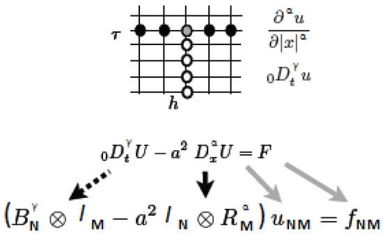 With these approximations for the fractional partial derivatives made with respect to both variables, we can discretize at once the fractional diffusion equation in (1) (see Figure 2), that is