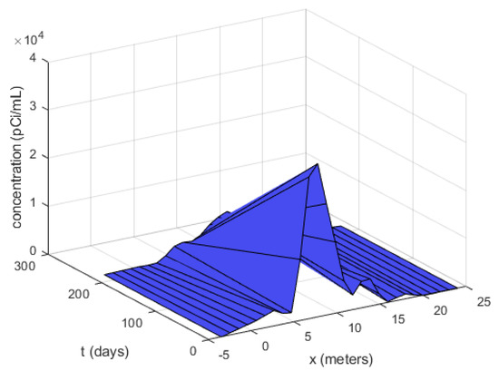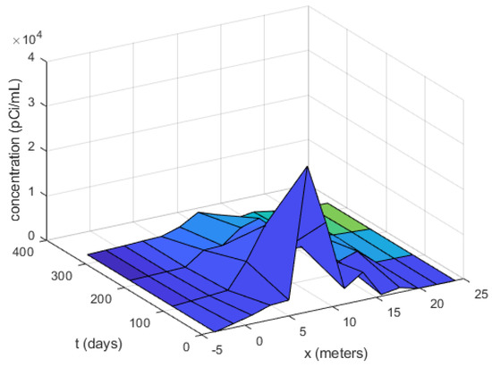 fractional in both, space and time, satisfied by the tritium concentration, , with , , , under the homogeneous boundary conditions (that will be extended to the entire real line), and the initial condition . Here are the delta functions. Indeed, introducing such a forcing term should more realistically account for describing a source located initially in the middle of the space domain; see the experimental data in Figure 3. Better results are in fact obtained doing so.