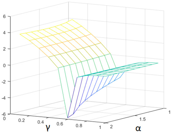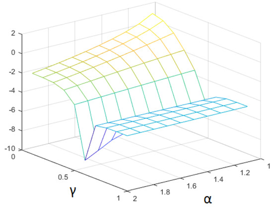 In particular, when and (that is, in the case of classical diffusion), larger errors, at least three times larger in the infinite norm, are obtained. The best results are obtained for (classical Laplacian), but with a time fractional derivative of order , that is, appreciably smaller than 1. In this case, we obtain the discrepancy