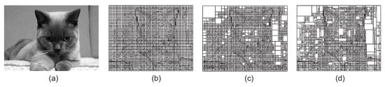 The image can be partitioned by different ways to obtain the range blocks, and they can be summarized into three major categories with the partitions shown in Figure 1 for the Cat image. Showing in Figure 1b is uniform partition, where all the blocks have the same size. An example to obtain the range block by uniformly partitioning the image array into distinct block, and rearrange them as a column vector for storage. The total number of distinct blocks being partitioned from a image array is given by , and hence the total memory size required to store all range blocks is given by