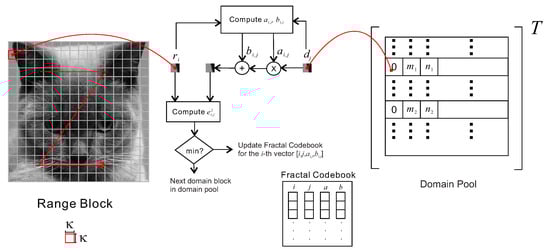 To complete the encoding of the image, the range block is matched with the domain block in . To find the best match domain block for a given domain block, we have to scale and offset the domain block, where the optimal scaling and graylevel offset can be obtained with direct application of the Collage Theorem in Equation (11). The Collage error of the domain block in the for the range block given by