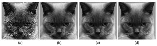 Cat image of size encoded with range block fractal and decoded under different iterations an initial image of a zero matrix: (a) the 3rd iteration; (b) the 5th iteration; (c) the 7th iteration; and (d) the 20th iteration.