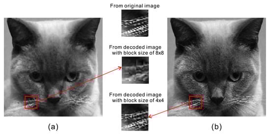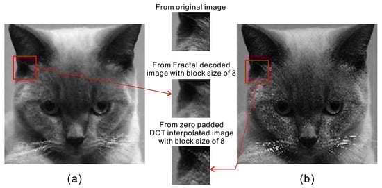Comparison of Cat image of size by (a) fractal decoding with 20 iterations and (b) zero padded DCT interpolation with only the low frequency DCT coefficients block being retained, where the same block size of is adopted in both methods.