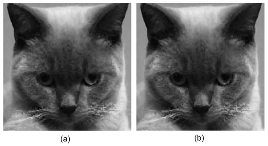 Comparison of Fractal decoded Cat image of size obtained from the same fractal codebook but with different initial images at the 20th iteration, where the same block size of is applied in the decoding: (a) a zero matrix as an initial image and (b) the original Cat image as initial image, where both the decoded images have the same PSNR and SSIM at 26.54 dB and 0.726, respectively.