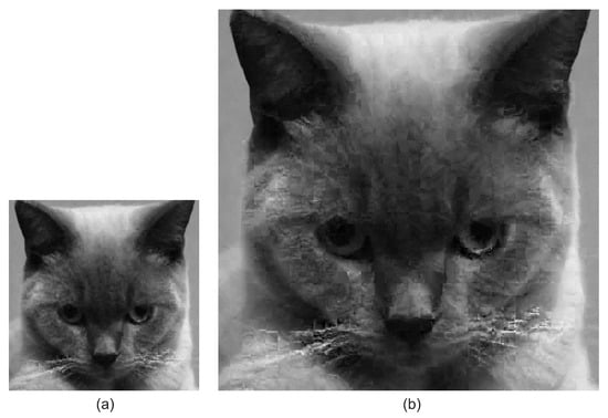 Fractal zoom-in Cat image in (a) the same size as that of original image (i.e., ) and (b) an enlargement to the size of , with both images decoded with identical range block size of , zero image as initial image, and the number of iterations of 20 (PSNR = 25.2695 dB, SSIM = 0.7659).