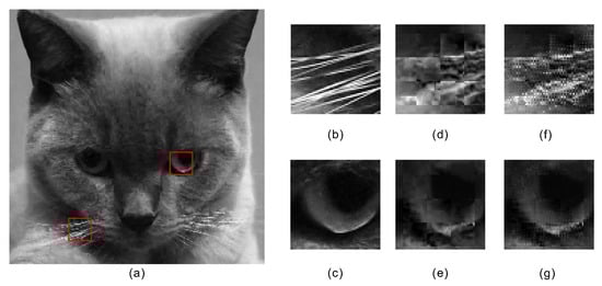 Fractal interpolated Cat image by a factor of 2 to at the 15th iteration with range block size of interleaved with low-resolution Cat image pixel layer (PSNR = 26.41 dB, SSIM = 0.8542): (a) the full interpolated image; zoom-in portion of the whiskers of (b) the original Cat image, (d) the interpolated image by fractal decoding with , and (f) the interpolated image by fractal interpolation with interleaving; zoom-in portion of the eye of (c) the original Cat image, (e) the interpolated image by fractal decoding with , and (g) the interpolated image by fractal interpolation with interleaving.
