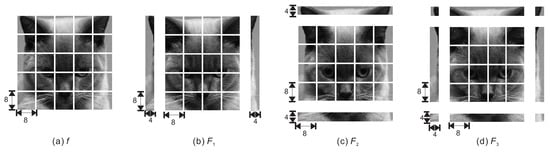 Illustration of different block partition methods: (a) the original “non-shifted” image f; (b) the “horizontal shifted” image ; (c) the “vertical shifted” image ; and (d) the “diagonal shifted” image .