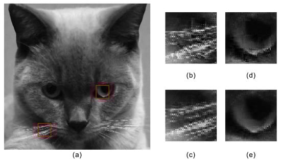 A interpolated Cat image by mean filtering a set of four cyclic spin fractal decoding images (original plus 3 other shifted images) with doubled range block size (i.e., ) and interleaved low-resolution image pixels using fractal interpolation method with interleaving (PSNR = 27.39 dB, SSIM = 0.887): (a) the full interpolated image; (b) zoom-in portion of the whiskers of the Cat image obtained from fractal interpolation method with interleaving but nomean filtering (same as Figure 8f), and (c) from mean filtering shifted fractal decoded images; (d) zoom-in portion of the eye of the Cat image obtained from a fractal interpolation method with interleaving but no mean filtering (the same as Figure 8g), and (e) from mean filtering shifted fractal decoded images.