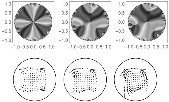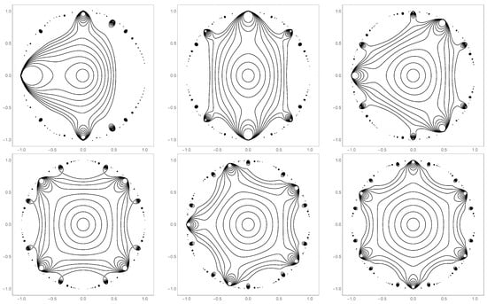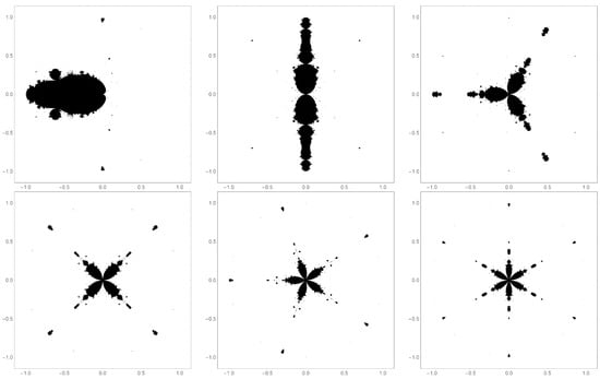 As a visual representation, one can plot the movement of these fixed points in the complex plane as changes. Figure 12 shows the way in which the fixed points move, as described above, for the case for k = 1–6. Precisely k primary fixed points “emerge” from the zero fixed point as becomes non-zero. These fixed points arc away from the origin as is increased. The k-fold rotational symmetry is seen in those graphs.
