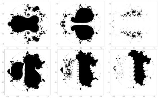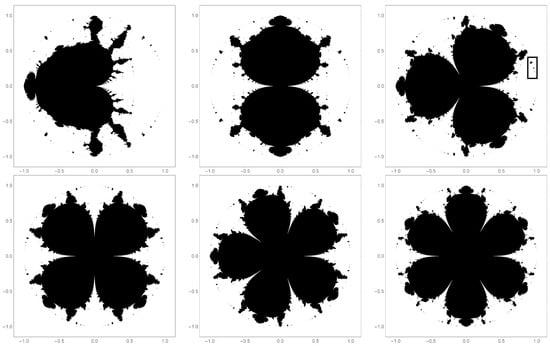 In general, the fixed points act as meta-stable attractors. Some trajectories can be found that orbit them many times before moving either to a stable orbit around the zero fixed point or diverging from the unit disk. For a very recent analysis of orbits and escape time algorithms for fractals associated with finite polynomials, the reader is directed to the work of Nazeer and Kang’s group [,,,].