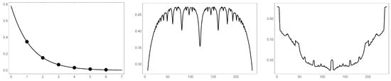 Another item of note is that when there is not a phase rotation, the distance from the origin to the nearest divergent point is the smallest it will be (see left image of Figure 5). The next smallest distance is when the value is exactly . This graph is shown for in the bottom right of Figure 4 and the values of radius are shown in the middle graph of Figure 5. This property of nearest divergent point is also illustrated in Figure 5 as a function of j. The left plot of Figure 5 shows the largest radius that can be made centered at the origin when the number of iterations (j) of the function is increased. As is shown, when j is relatively small, the penetration of the cleft is relatively shallow. However, as j increases, the radius of a circle centered at the origin can be fit to an exponential decay (seen in the left graph of Figure 5).