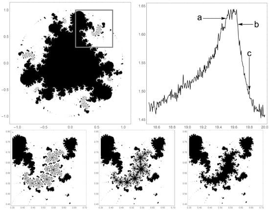The calculated box dimension of the Julia sets for 400 by 400 lattice points between x and y values of and 1 results in a beautiful, elaborate image which is displayed in Figure 9 for the case of . Typically, the values of the dimension (when calculable) range from approximately 1.1 to 1.8. Narrow paths of high end values of dimension cut through the image in circular arcs. It is known that dimensions of Julia sets of , where c has values near the boundary of the Mandelbrot set, equals 2 []. In this work, the dimensions near the boundary of the Mandelbrot set are believed to be much less reliable than hose within it. For a more rigorous discussion of dimension at the boundary of the Mandelbrot set, see the work of Shishikura [].