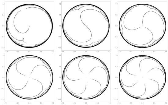The movement of the fixed points as runs from to for k values 1–6, . The points originating close to the center are the primary fixed points, whereas the points very close to the unit circle are the secondary fixed points.