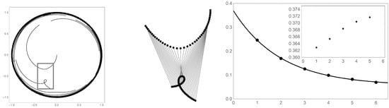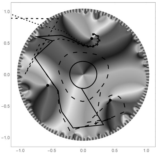 Investigating the orbit trajectories of initial points under the centered polygonal lacunary function iterative map reveals a strong sensitivity to initial conditions. Such is the case for the phase rotated, iterative map example shown in Figure 14. The phase rotation is and the truncation is set to . One initial point considered is which settles into a stable orbit after approximately 50 iterations. The nearby initial points at and diverge from the unit disk after 14 and 16 iterations respectively.